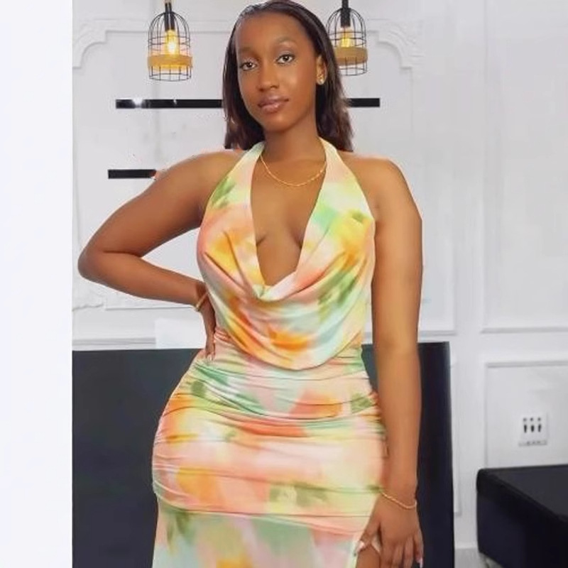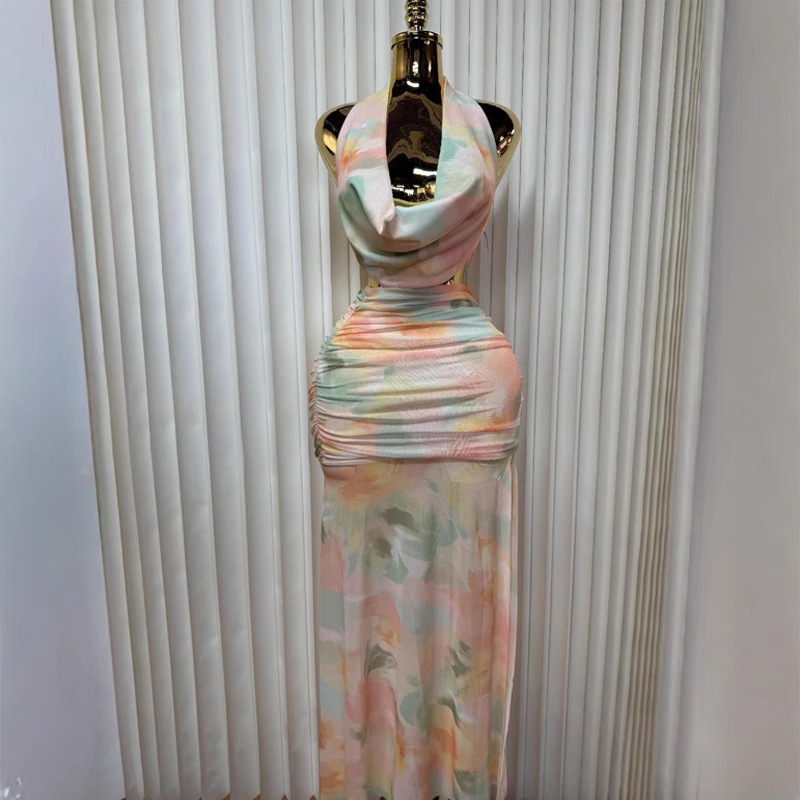 This high-end maxi dress features a carefully printed pattern combined with a split design that enhances movement and style. The halter neckline accentuates the shoulders, while the backless cut adds a captivating element of elegance. Crafted from quality fabric, the dress offers comfort and a flattering fit, making it suitable for formal events and special gatherings.
