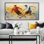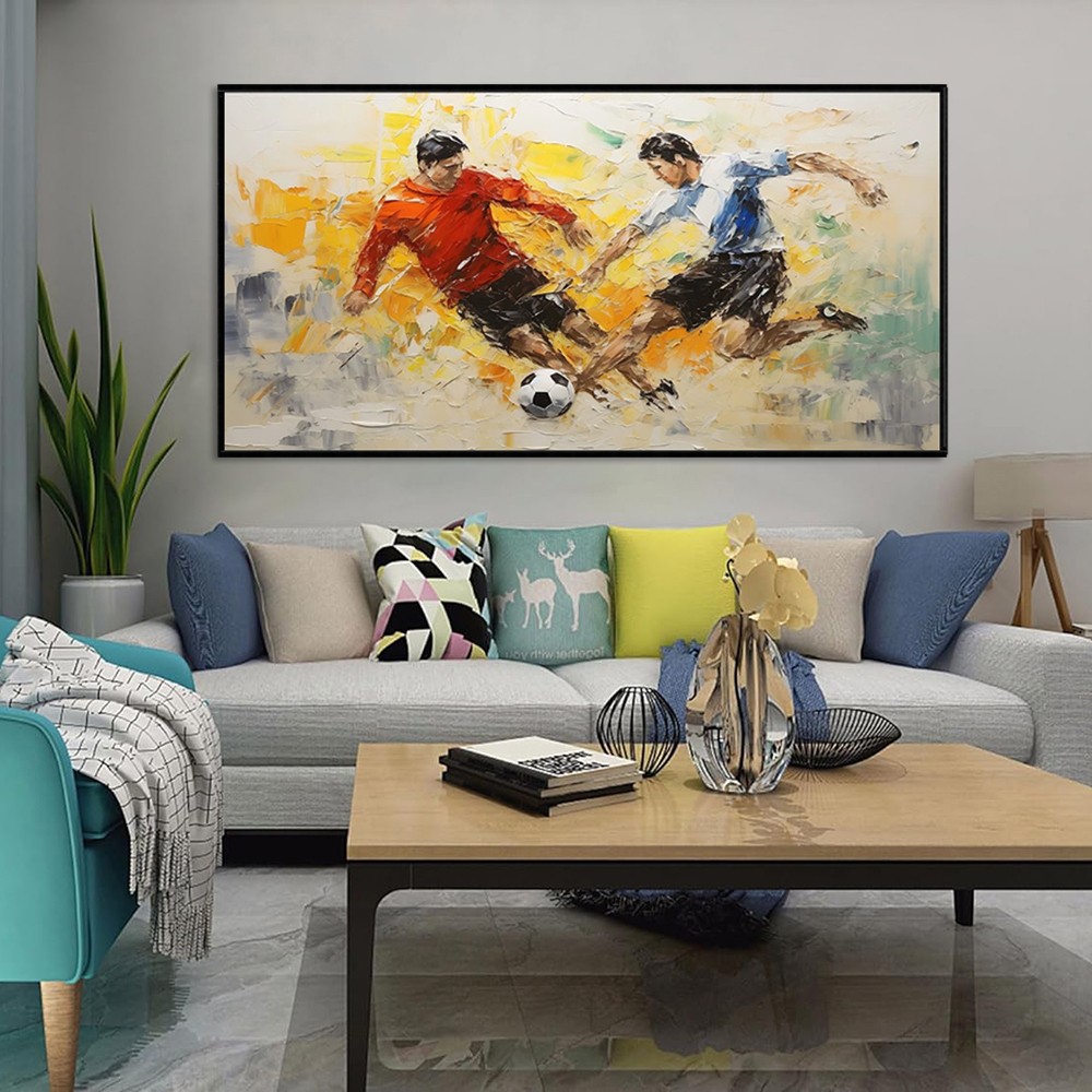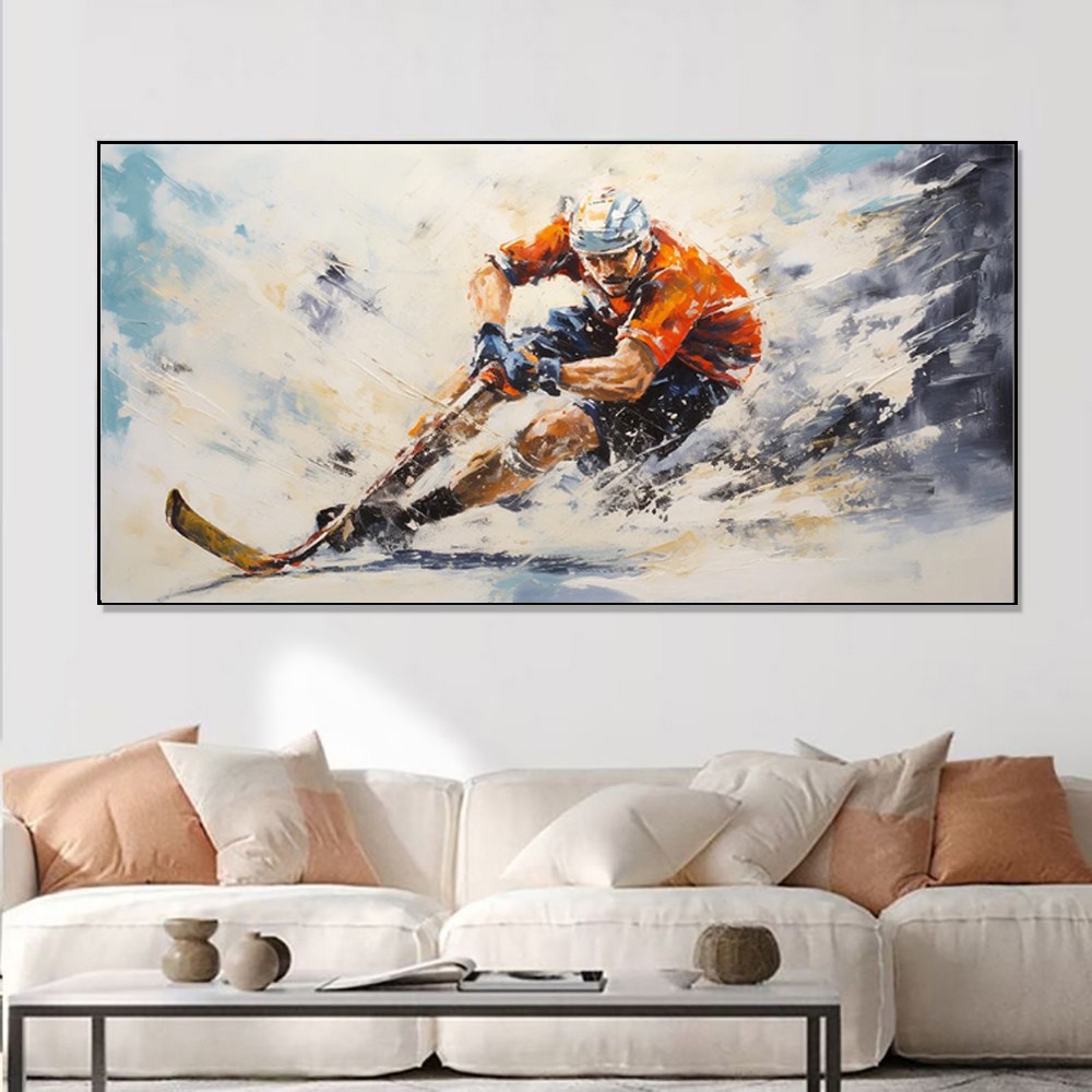 This high-quality, handmade oil painting showcases detailed portraits of athletes engaged in sports such as cycling, equestrian, football, and ice hockey. Created on a large canvas, the artwork offers a vibrant and dynamic visual, making it an ideal showpiece for home decoration. Its striking imagery and rich textures enhance living room walls with a sporty and artistic ambiance while reflecting dedication and athletic spirit. Crafted with premium oil paints, the painting ensures lasting color vibrancy and durability. This canvas art piece serves as an elegant addition to any modern or classic interior design.
