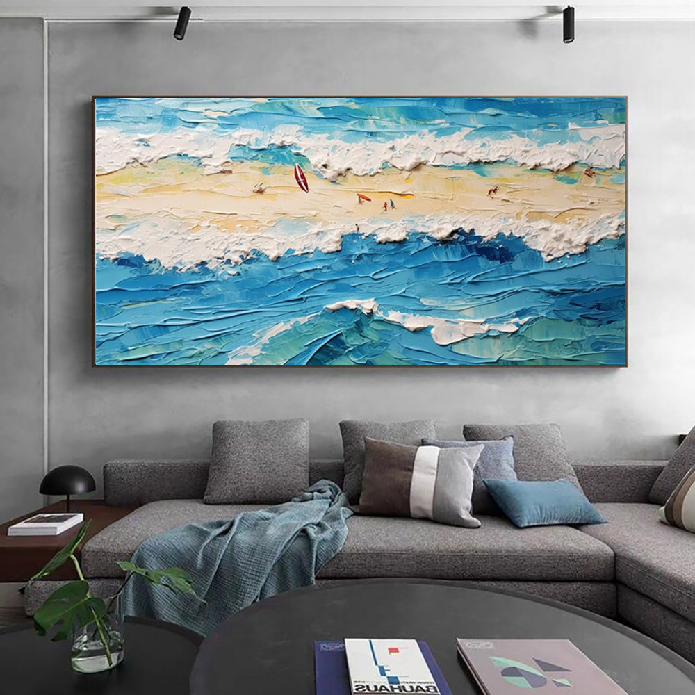 This premium handmade oil painting showcases a serene beach and sea scene with a sailboat, created using a traditional painting knife technique. Crafted on a large canvas, it offers a vivid and textured landscape that enhances any living room or home wall. Ideal as a sophisticated decorative piece, this artwork combines artistry with quality materials to bring coastal charm and vibrant colors into interior spaces.