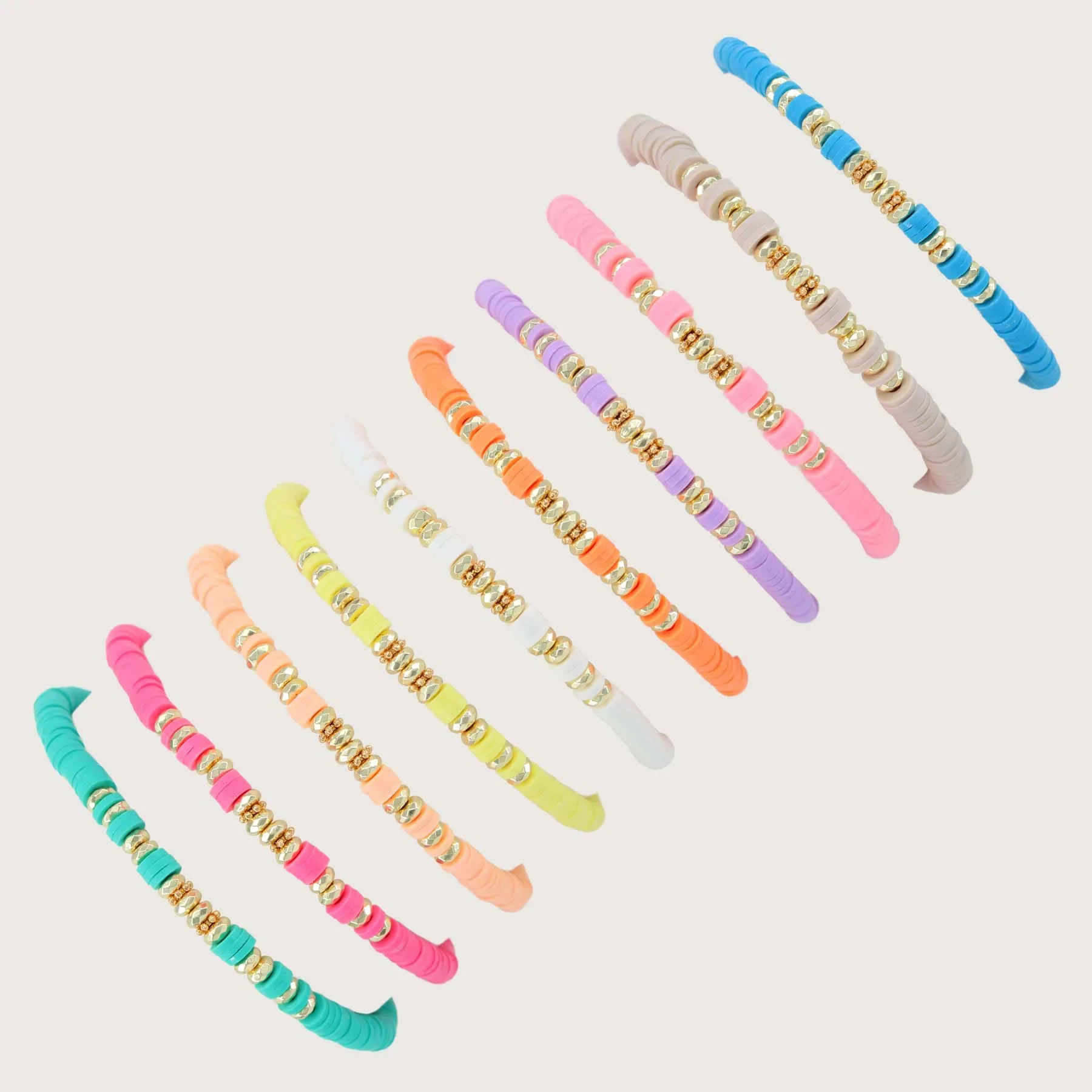 Elegant holiday beach-inspired bracelet with colorful polymer clay beads on an elastic string, designed for women.