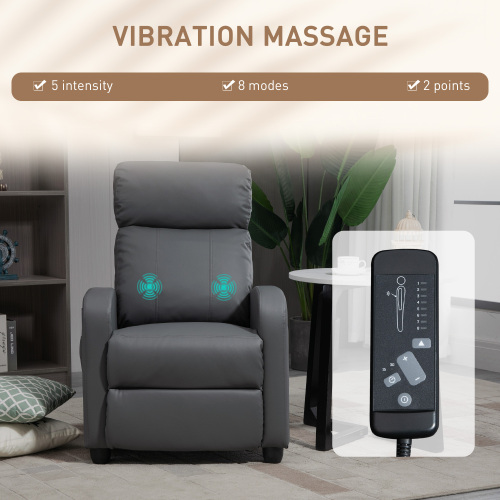 The HOMCOM Recliner Armchair features a durable faux leather upholstery in grey, designed to provide comfort and style for any home living room or theatre setting. This push-back reclining chair includes an adjustable leg rest for customizable relaxation and a built-in massage function to enhance comfort. Additionally, it is equipped with a convenient side pocket for storing remote controls, magazines, or other small items. The chair’s sturdy frame ensures stability and long-lasting use, making it a practical and elegant addition to indoor seating areas.