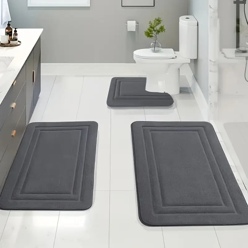 This Home Hui-style bathroom floor mat set consists of three pieces designed to enhance bathroom comfort and safety. Crafted from soft, absorbent materials, these mats effectively soak up moisture to keep floors dry and slip-free. The non-slip backing ensures secure placement, preventing accidental slips on wet surfaces. Featuring a stylish and practical design, this set complements various bathroom décors while providing a cozy underfoot experience.