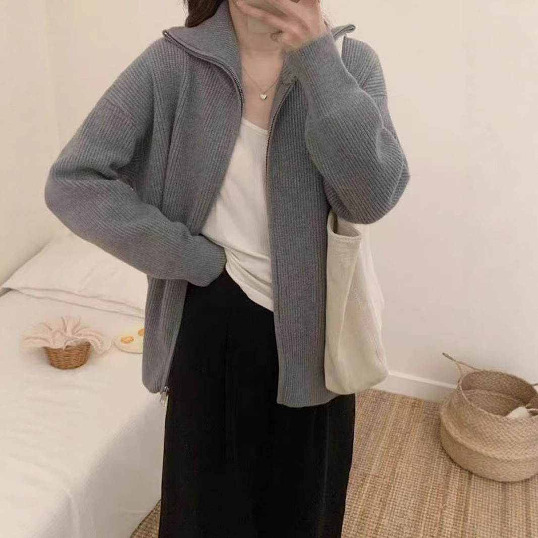 Stylish Hong Kong style double zipper knitted cardigan jacket, perfect for casual wear with a modern and comfortable fit.