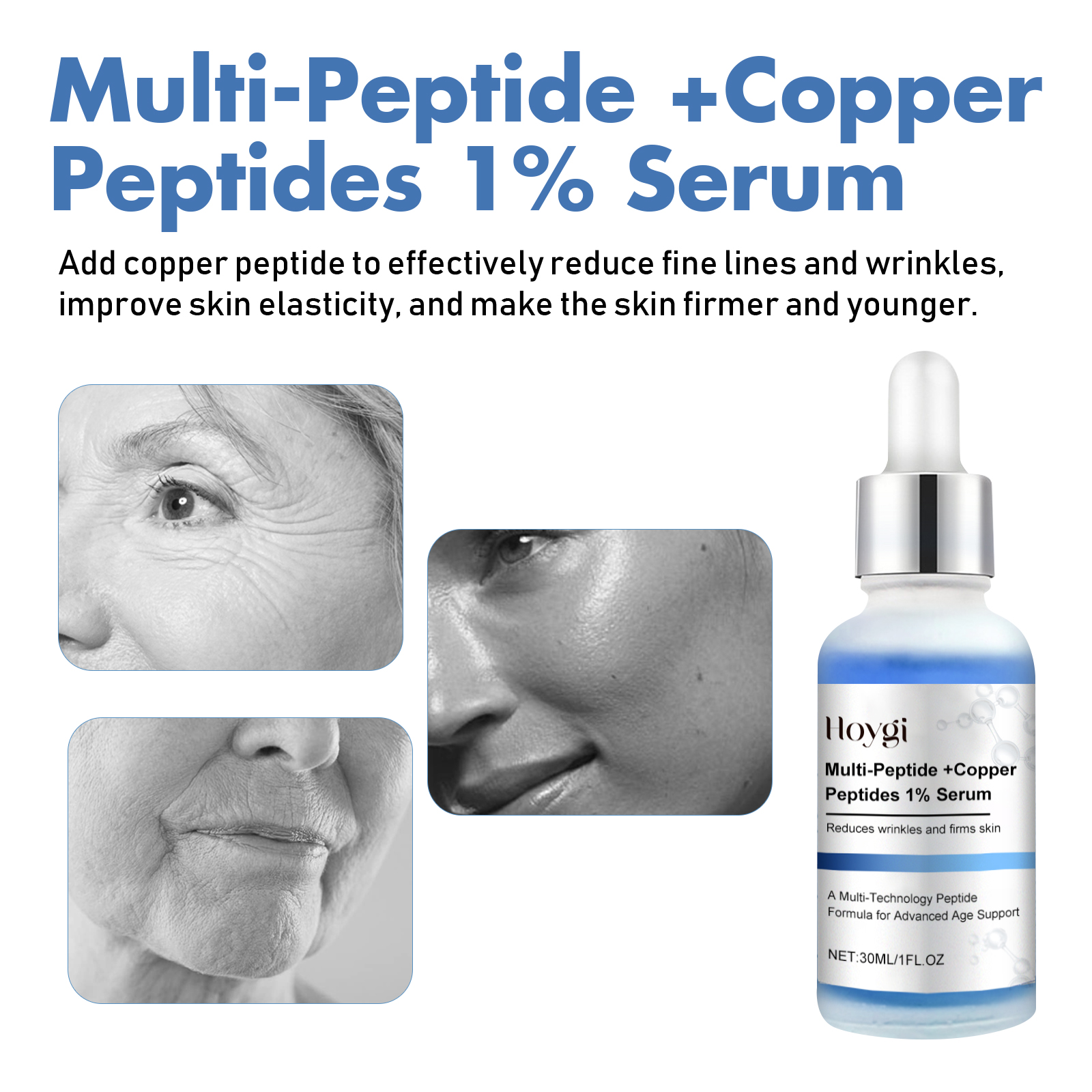 Hoygi serum with multi-peptides and 1% copper peptides reduces fine lines and wrinkles, firms skin, and enhances elasticity.