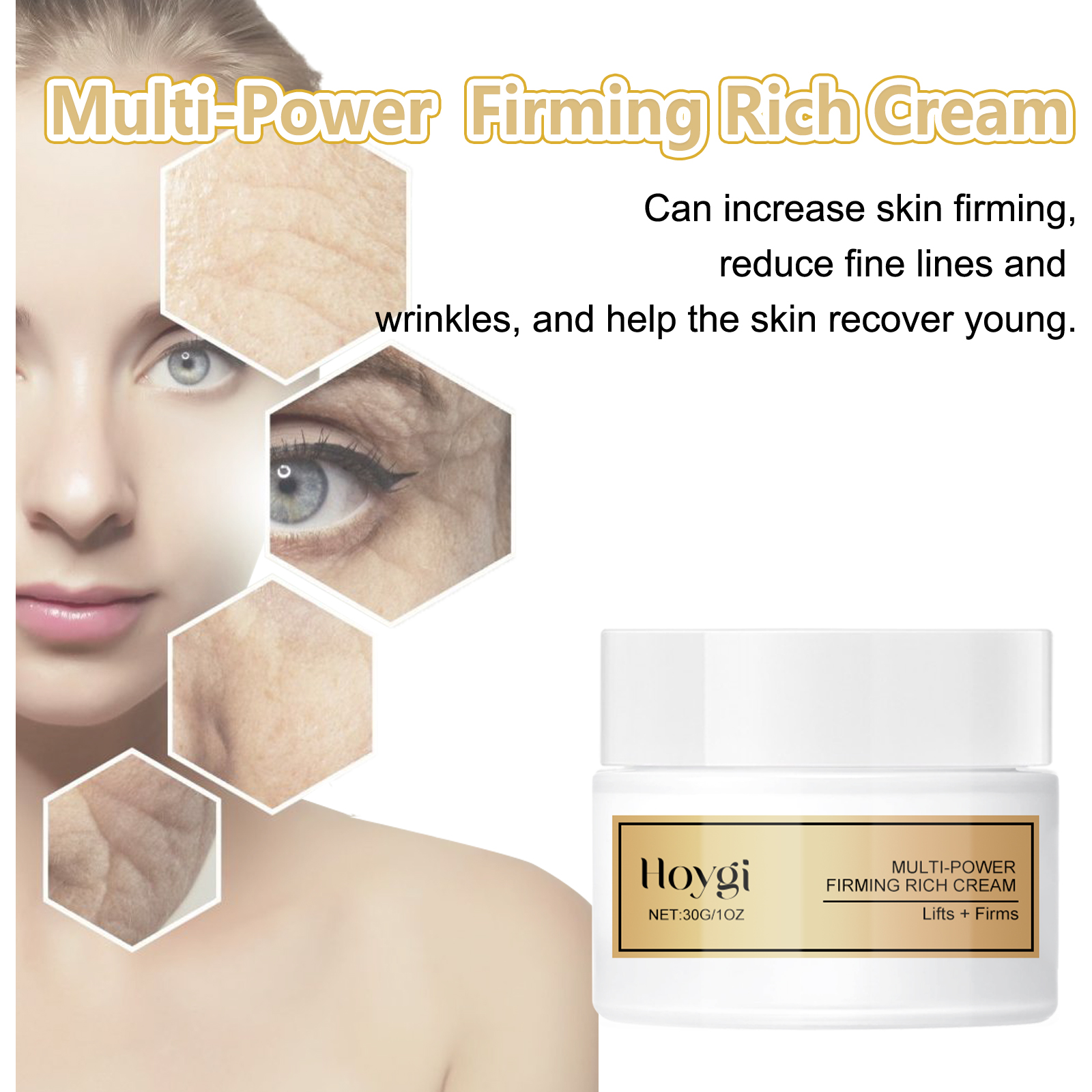 Our Multi-Power Firming Rich Cream contains Hydrolyzed Collagen, Hyaluronic Acid, Ascorbic Acid. It increases skin firmness, reduces fine lines and wrinkles, and helps rejuvenate skin, providing the moisture and nutrients it needs to keep skin soft and smooth. Its application method is very simple: clean the face, evenly apply the cream to the face skin, gently massage until completely absorbed. It can increase skin firmness, reduce fine lines and wrinkles, and help rejuvenate skin.