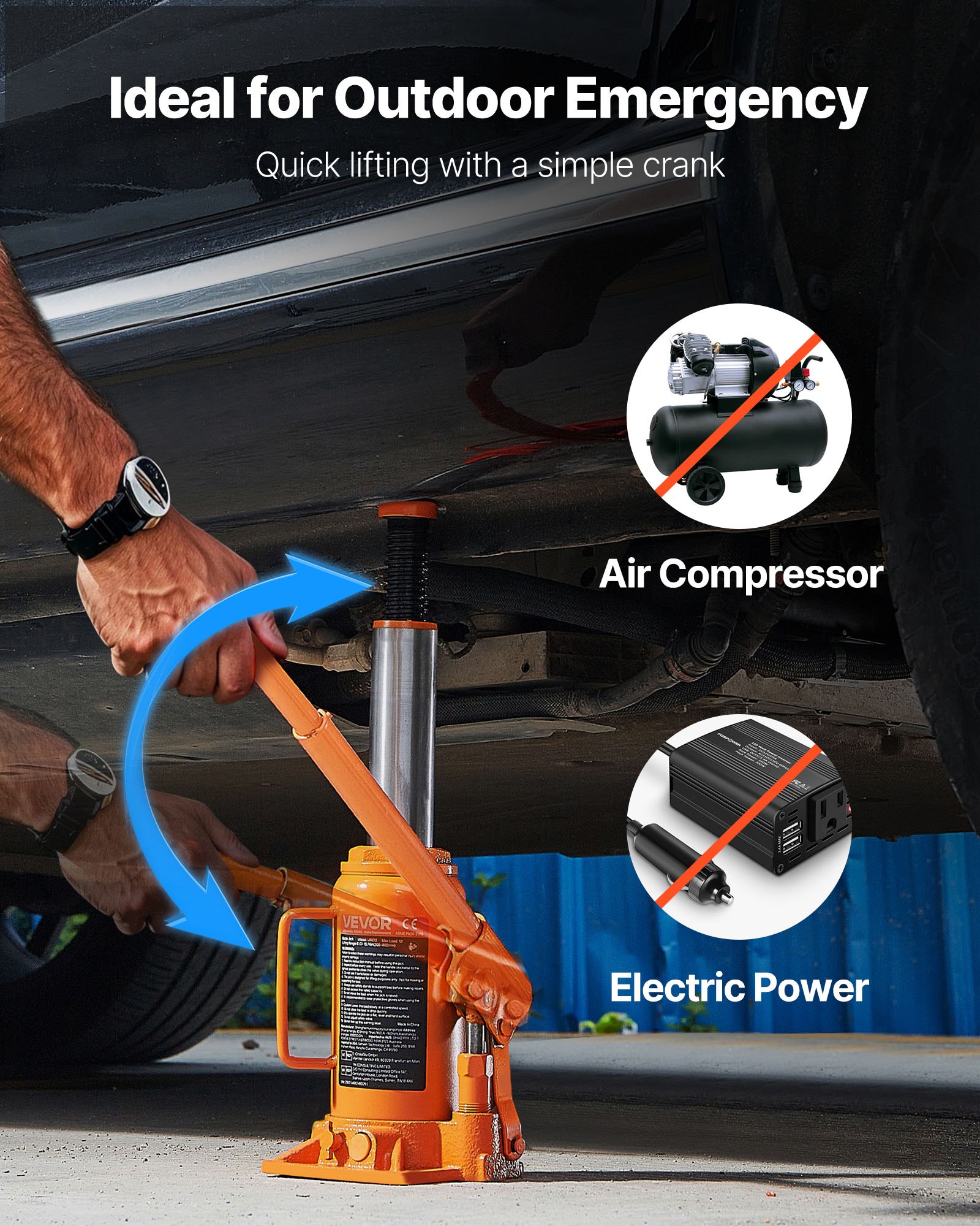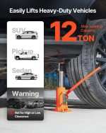 This hydraulic bottle jack offers a robust 12-ton (26,455.5 lbs) lifting capacity, designed for heavy-duty applications including car, SUV, and pickup maintenance, as well as agricultural and household lifting tasks. Constructed with a sturdy welded steel body, it ensures long-lasting durability and safety during use. The lifting range spans from 8.1 to 15.7 inches, providing versatile height adjustment to suit various repair and lifting needs. Finished in a vibrant orange color, this jack combines functionality with high visibility. Its compact design allows for easy storage and portability, making it a reliable tool for automotive repairs and industrial equipment servicing.