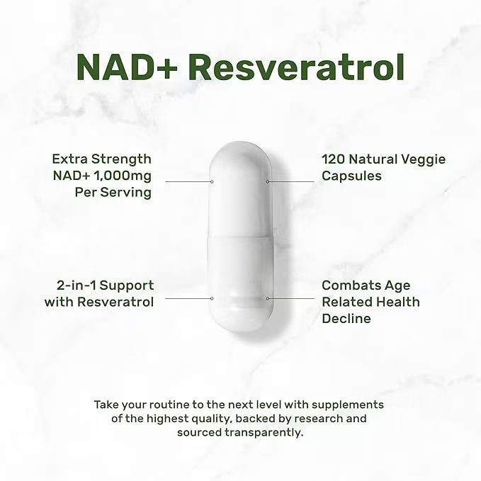 Premium NAD and Resveratrol supplement with nicotinamide, 120 capsules for enhanced cellular health and longevity support.