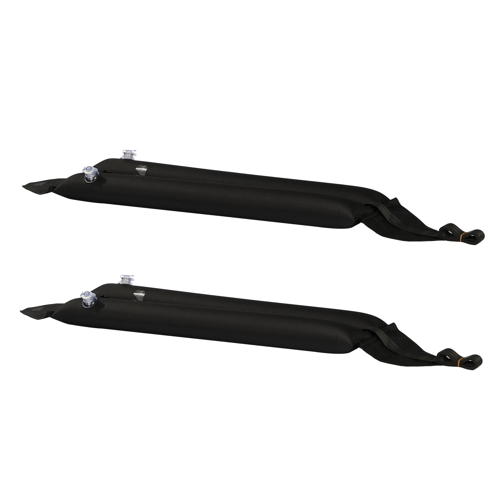 These inflatable soft roof rack bars measure 37.6 inches in length and are designed to fit most vehicles universally. Constructed for durability and secure transport, they support up to 88 pounds of cargo, including luggage, kayaks, canoes, surfboards, and stand-up paddleboards (SUPs). The package includes two tie-down straps and ropes to ensure load stability during transit. Additionally, a hand air pump is provided for convenient inflation and deflation, along with a storage bag for easy packing and transportation. This set offers a practical and protective solution for carrying bulky outdoor equipment on rooftop racks without causing damage to the vehicle or the cargo.