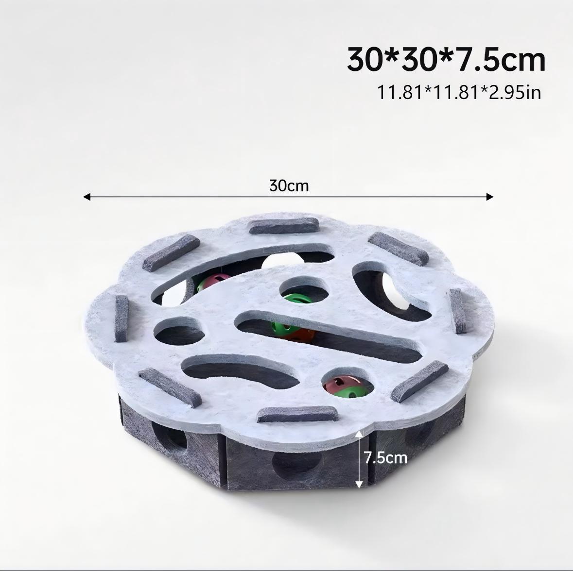 Durable felt cat puzzle toy with maze, bell ball, and pathways for indoor pet exercise and mental stimulation without batteries.