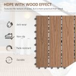 Composite outdoor interlocking deck tiles are an easy custom flooring enhancement for the patio, poolside, shower room, sauna, walkway, or even a greenhouse or urban garden. The patio tiles are composite material with a look and feel of real solid wood all without the hassle of splinters and maintenance. The slightly elevated wood floor tiles do not hold moisture and they allow water to evaporate more quickly, providing a step by the pool or shower. Check out this patio flooring and get your deck a new look. Features: – Made of highly durable WPC material made to withstand repeated use over long periods – Anti-slip properties even in wet conditions – Ability to withstand wind, rain, sun, and other weather elements – Multifunctional, perfect for the garden, balcony, pool, bathroom, and more – DIY design, it can be cut into smaller pieces to fit your individual needs – Easy to assemble with an interlocking snap design – 11 piece set covers 10 square feet per box Specification: – Color:Teak – Material: WPC – Net Weight: 21 lbs. – Per Tile Dimensions: 11.8″ L x 11.8″ W x 0.86″ H – Covering Area: 10 sq. ft. Features: – Made of highly durable WPC material made to withstand repeated use over long periods – Anti-slip properties even in wet conditions – Ability to withstand wind, rain, sun, and other weather elements – Multifunctional, perfect for the garden, balcony, pool, bathroom, and more – DIY design, it can be cut into smaller pieces to fit your individual needs – Easy to assemble with an interlocking snap design – 11 piece set covers 10 square feet per box Specification: – Color: Grey – Material: WPC – Net Weight: 21 lbs.