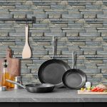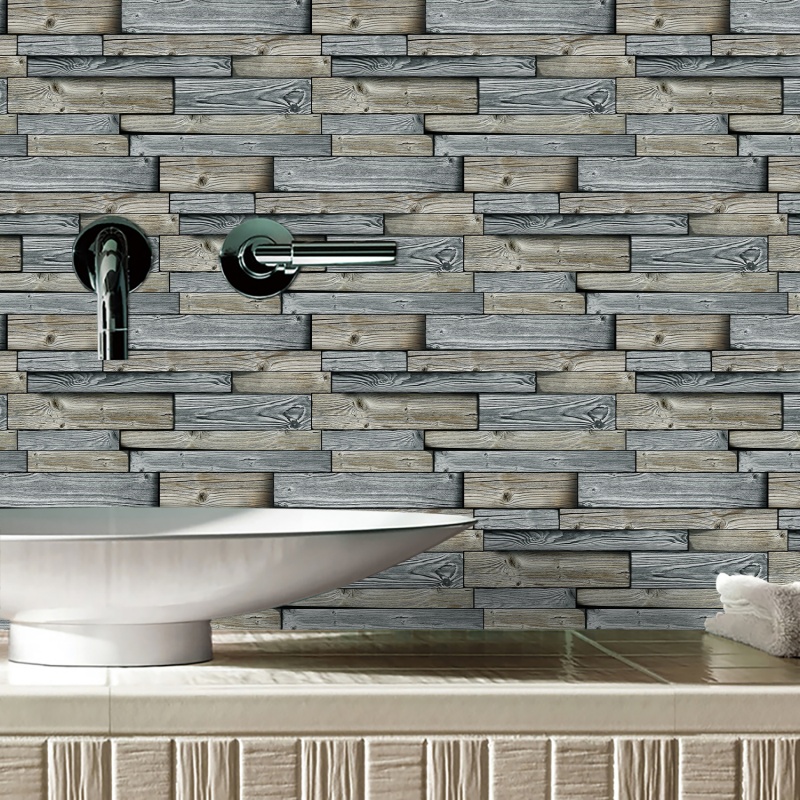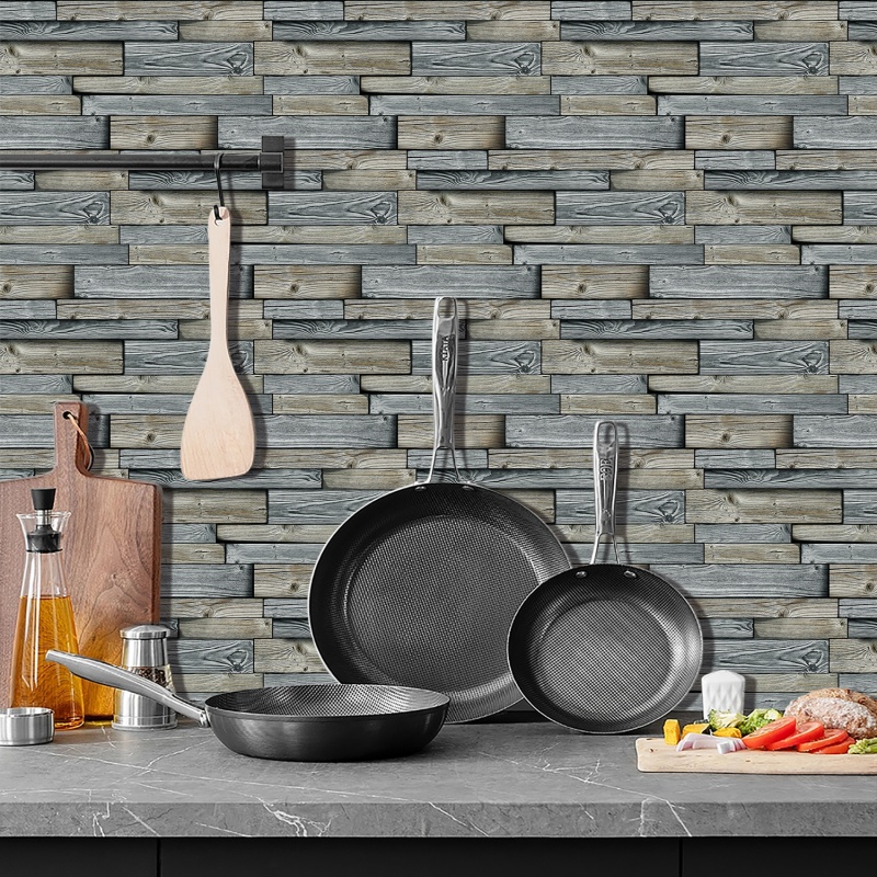 Waterproof, oil-proof peel and stick wood grain wallpaper ideal for kitchen and bathroom decoration.