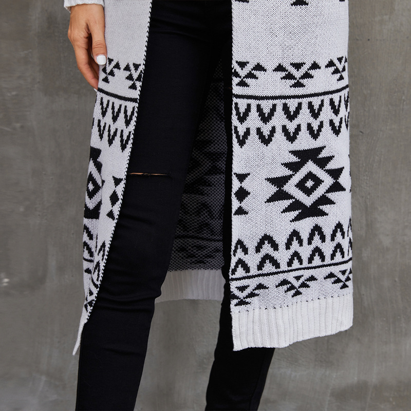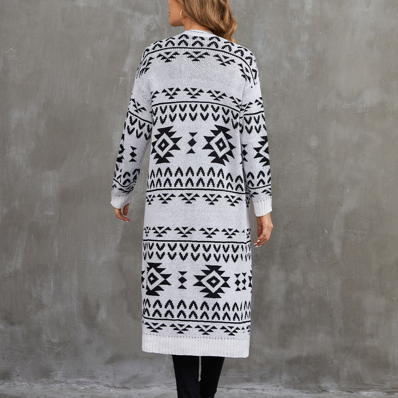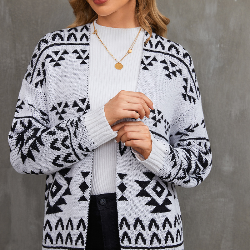 Stylish jacquard knit sweater jacket featuring a long casual cardigan design, perfect for versatile layering and comfort.