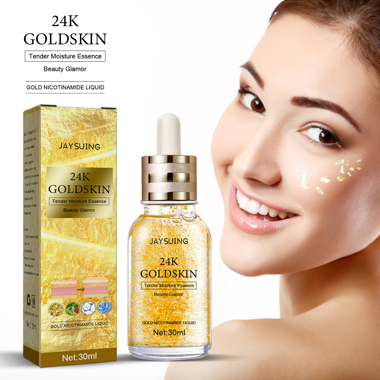 Jaysuing 24K Gold Collagen Serum tightens, brightens, moisturizes skin and reduces wrinkles for a youthful appearance.