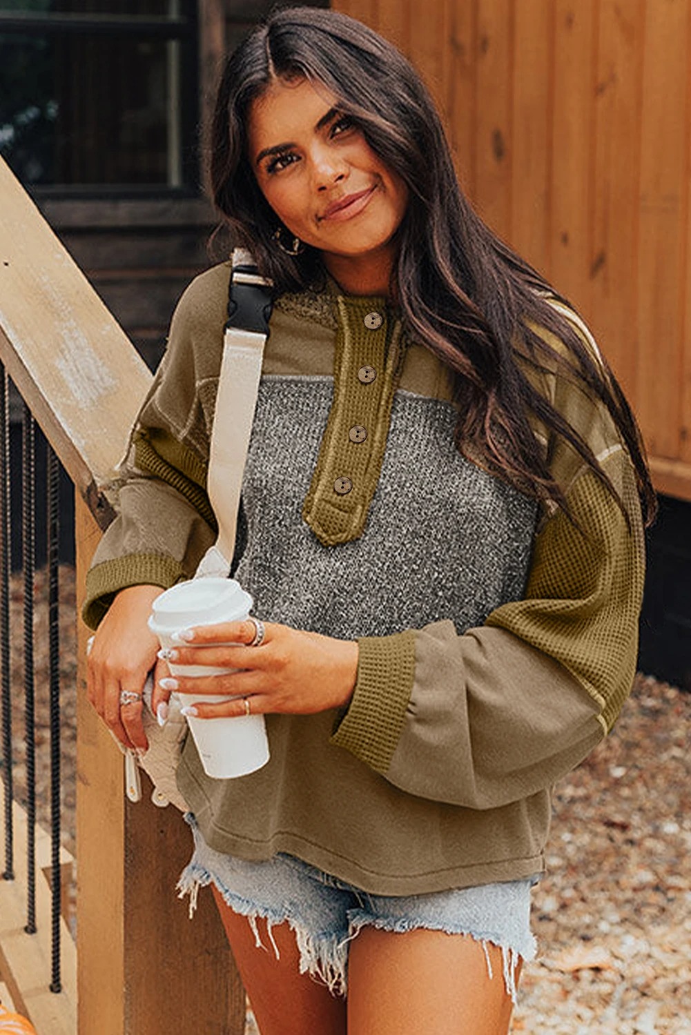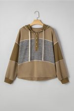 Be the first to review “Jungle Green Mixed Texture Stitching Exposed Stitching Half Button Pullover Hooded Sweatshirt” Cancel reply