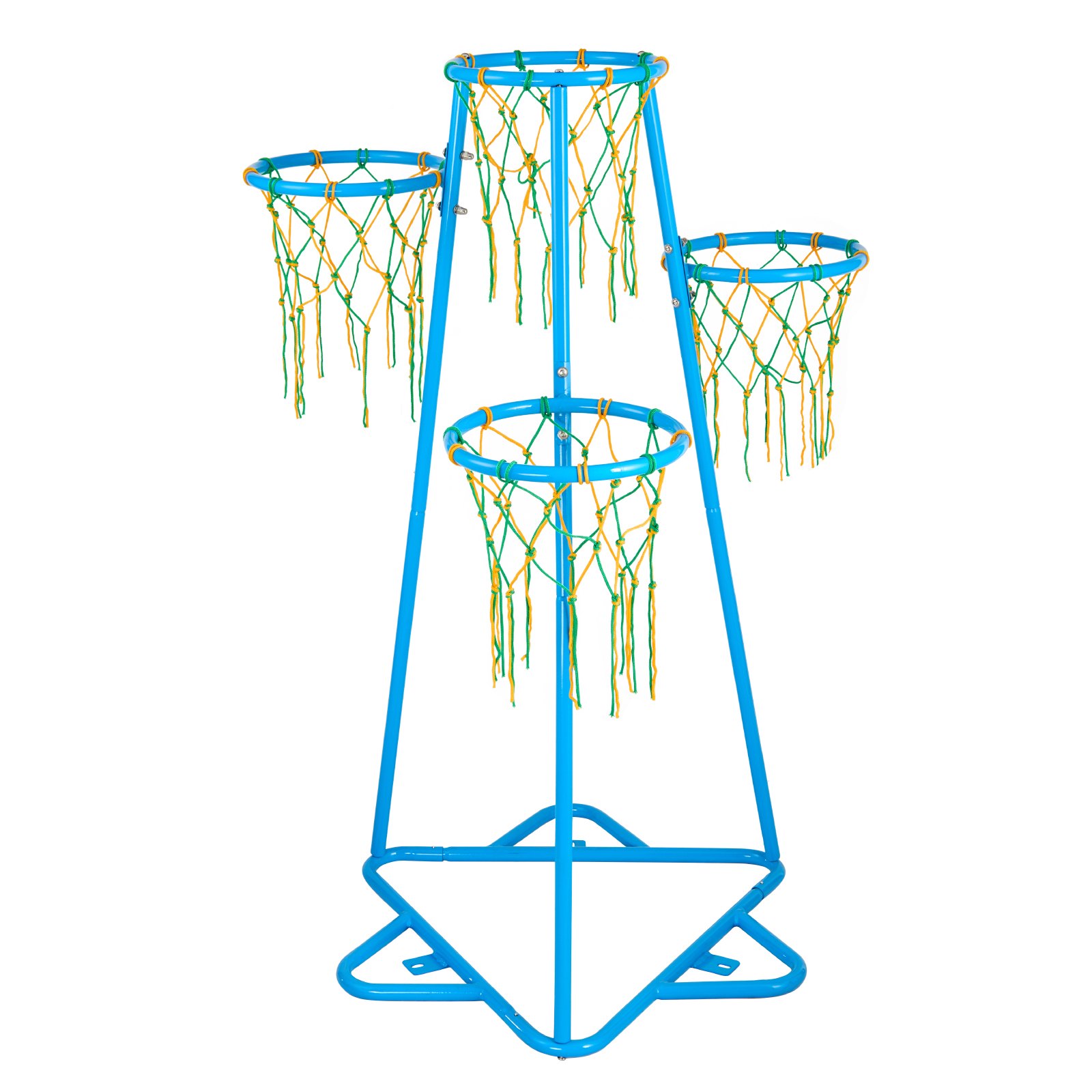 This portable kids basketball hoop set includes a stand with four separate hoops, designed to provide multiple players with simultaneous shooting opportunities. The stand features adjustable heights, allowing customization to accommodate children of various ages and skill levels. Made from durable materials, the structure ensures stability during active play. Its compact, lightweight design allows easy relocation, making it ideal for both indoor and outdoor use. This basketball hoop set encourages physical activity, coordination, and friendly competition among children.