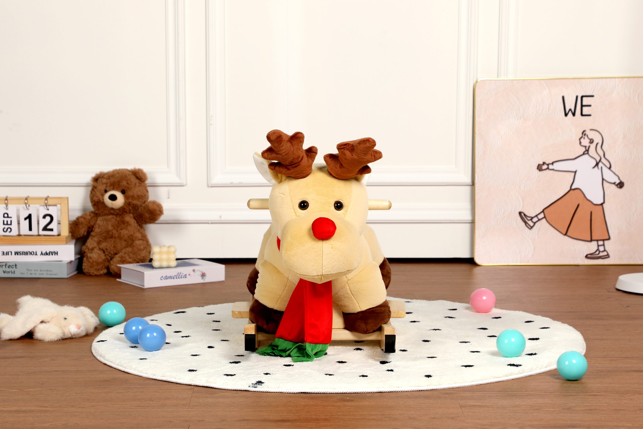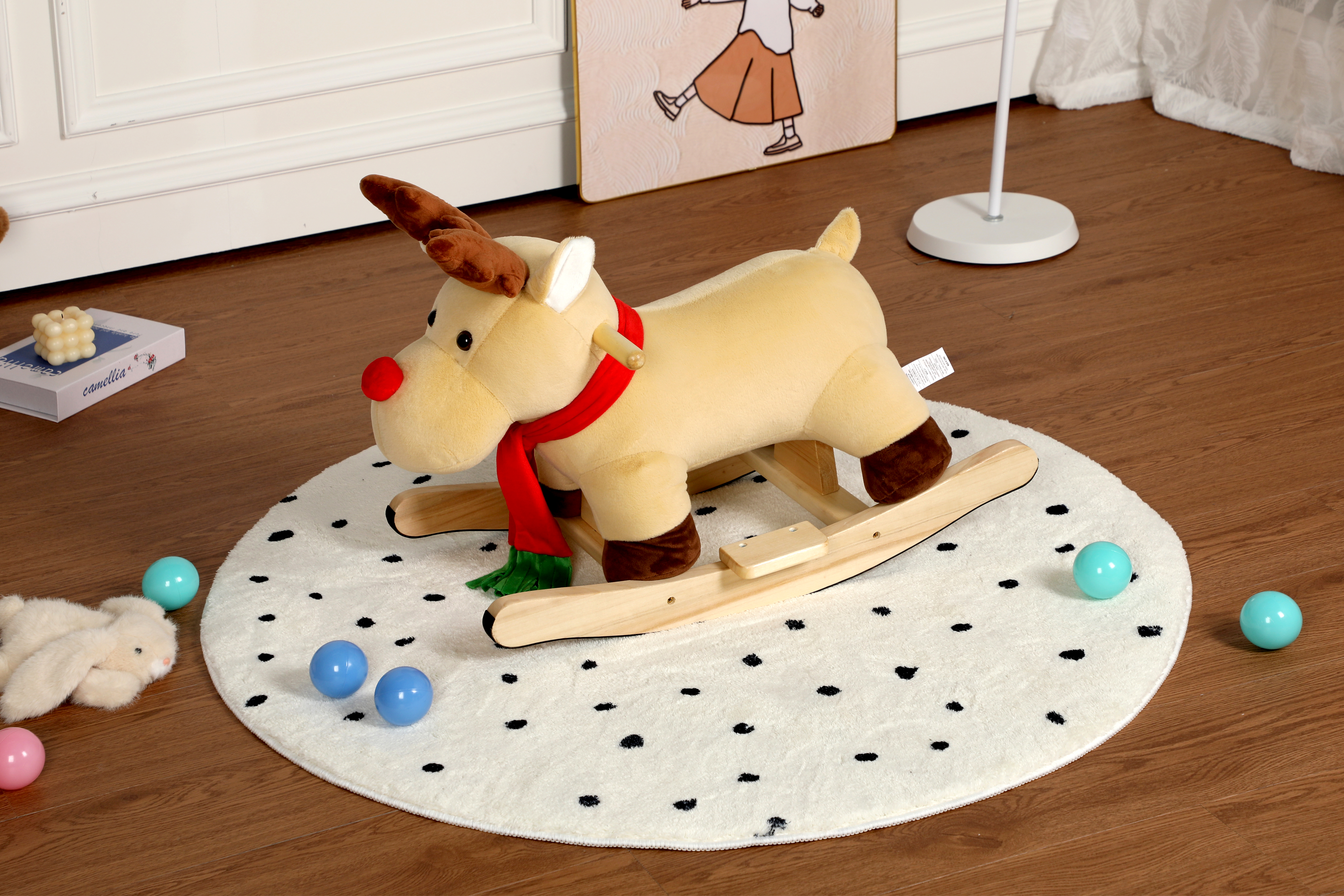 Product Name:Kids Ride-On Rocking Horse Toy with Lullaby Song,Moose Rocking Toy with Hand Puppets and Safety Belt For Children 1-3 Years,Soft Plush Fabric,Apricot,CPC Certified