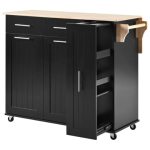 This black kitchen island features a drop leaf design and a rolling cart equipped with a 3-tier pull out cabinet organizer, enhancing storage capacity and accessibility. The unit includes two spacious drawers for utensils and kitchen essentials, along with an internal storage rack for added convenience. Constructed for mobility and functionality, the kitchen cart is mounted on wheels with a towel rack, making it a versatile addition to any kitchen space for both organization and food preparation.