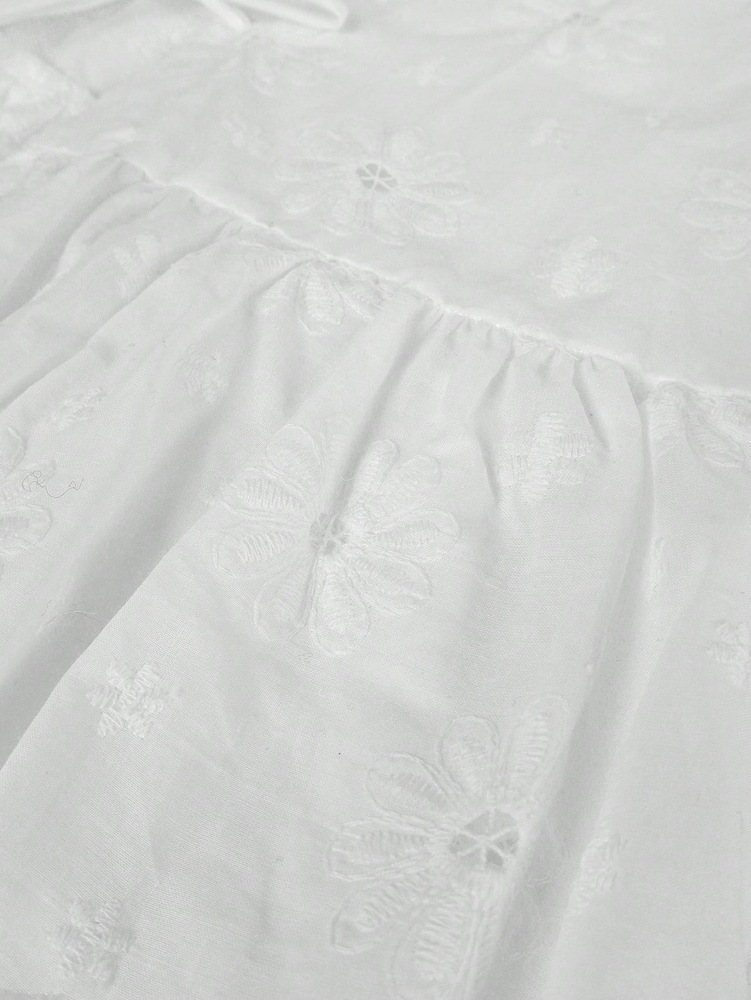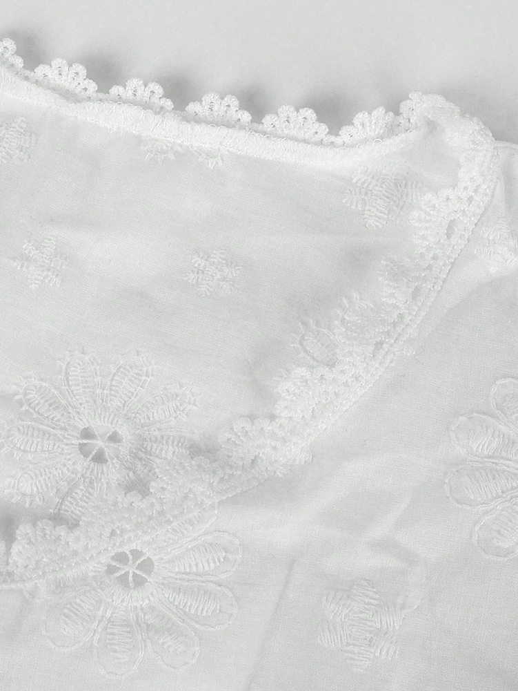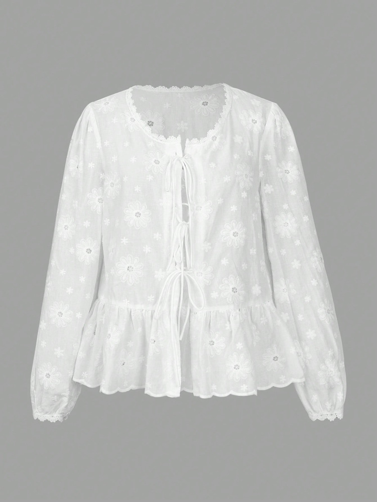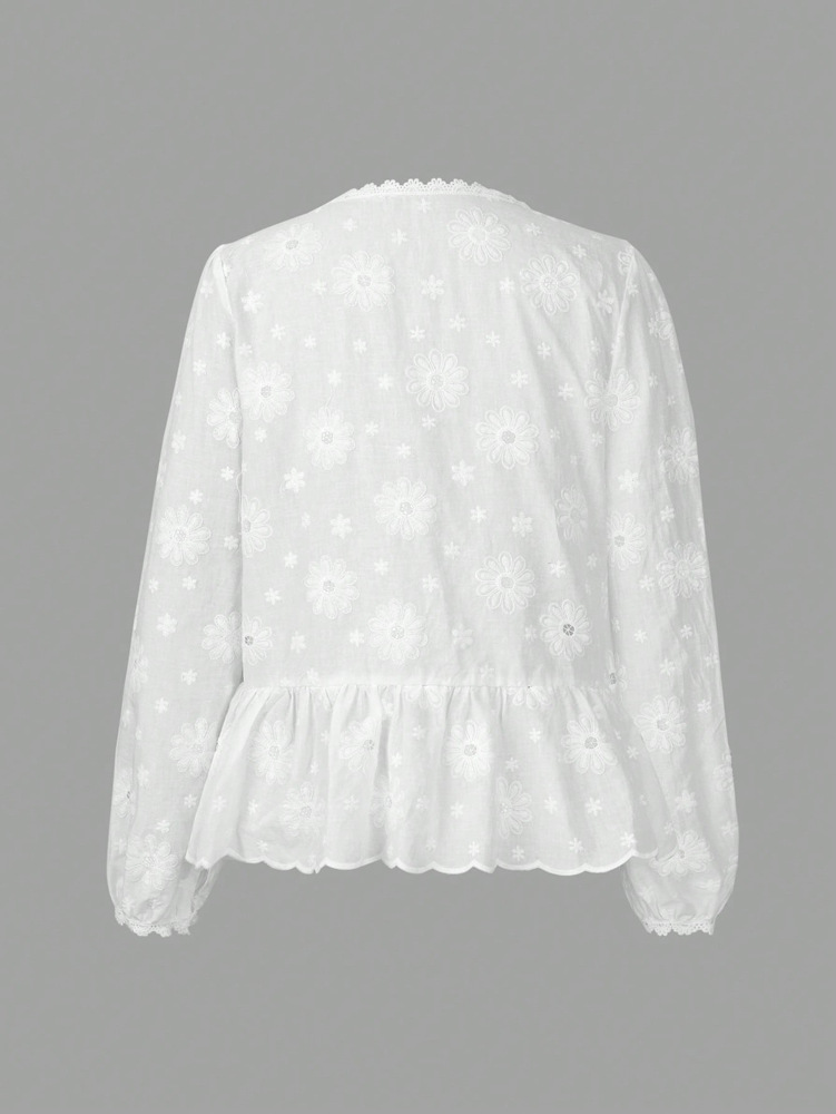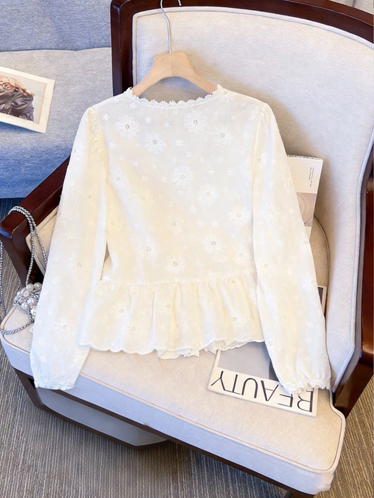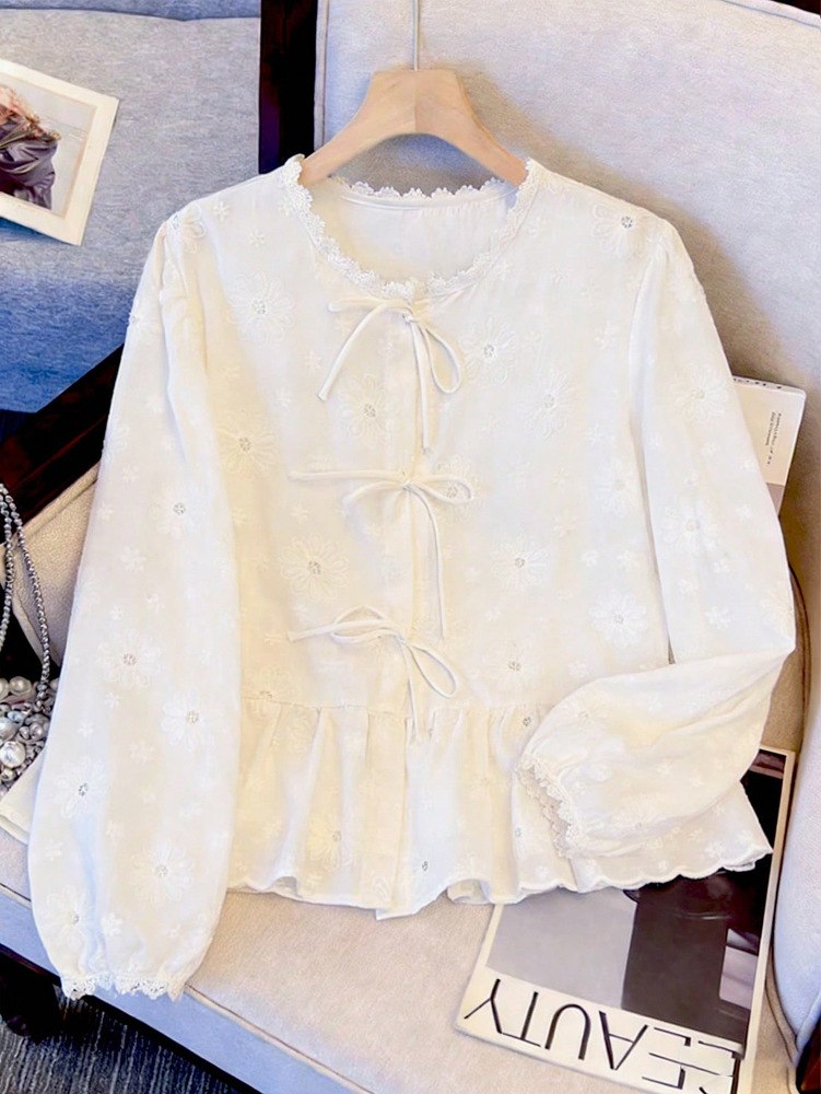 Elegant Korean-style long-sleeve blouse with patchwork lace and intricate embroidery for a stylish, feminine look.