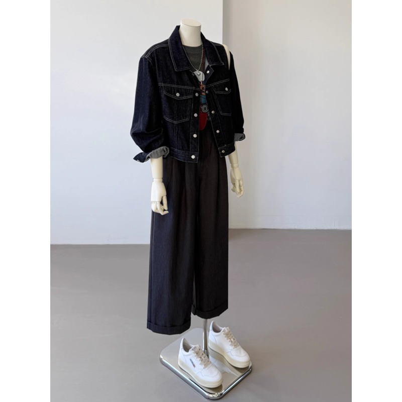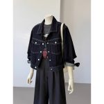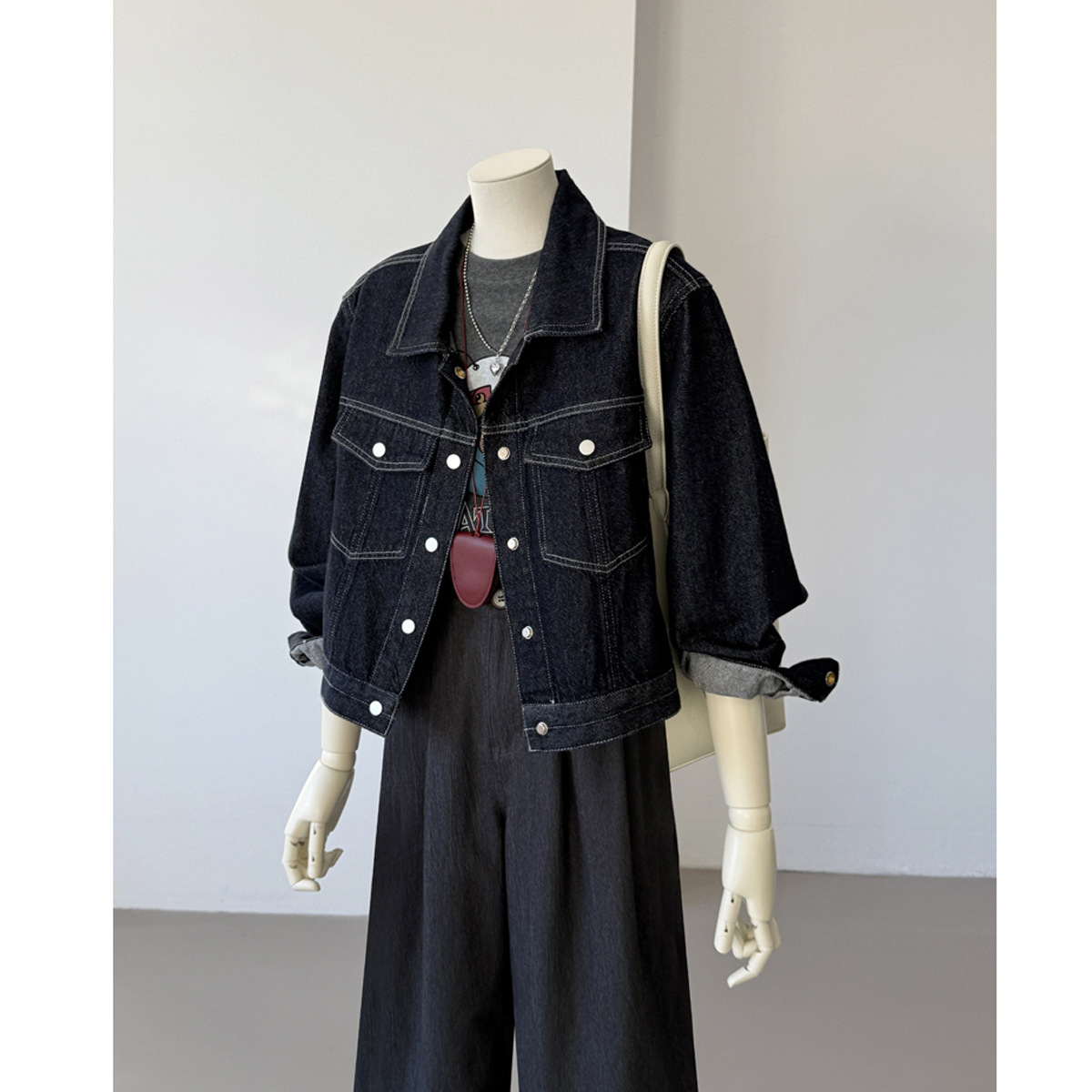 Retro-inspired dark blue short denim coat with Korean-style pocket lapels, combining classic fashion and durable comfort.
