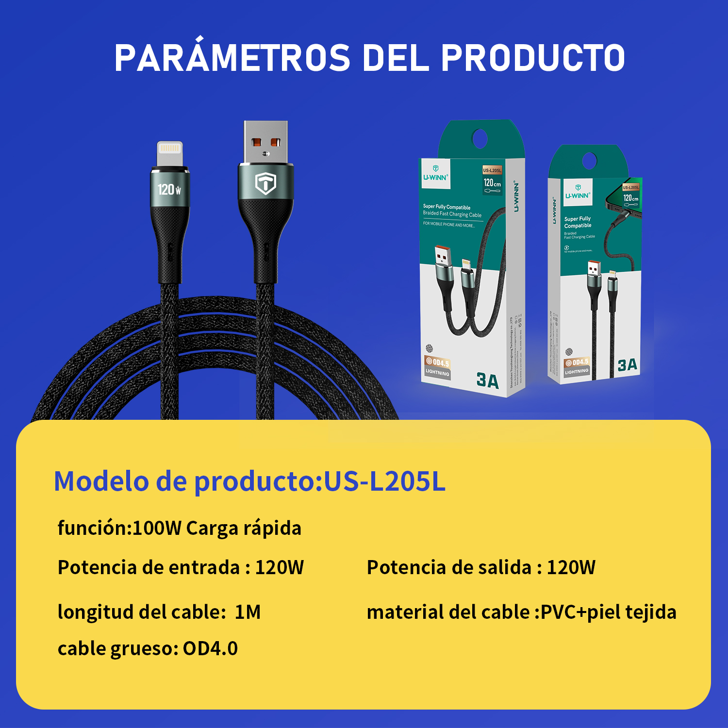 Durable 1-meter black L205 Lightning cable with 3A current support and USB 3.0 connectivity by UWINN for fast and reliable charging and data transfer.