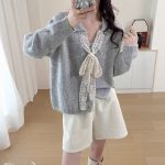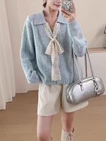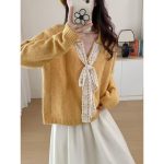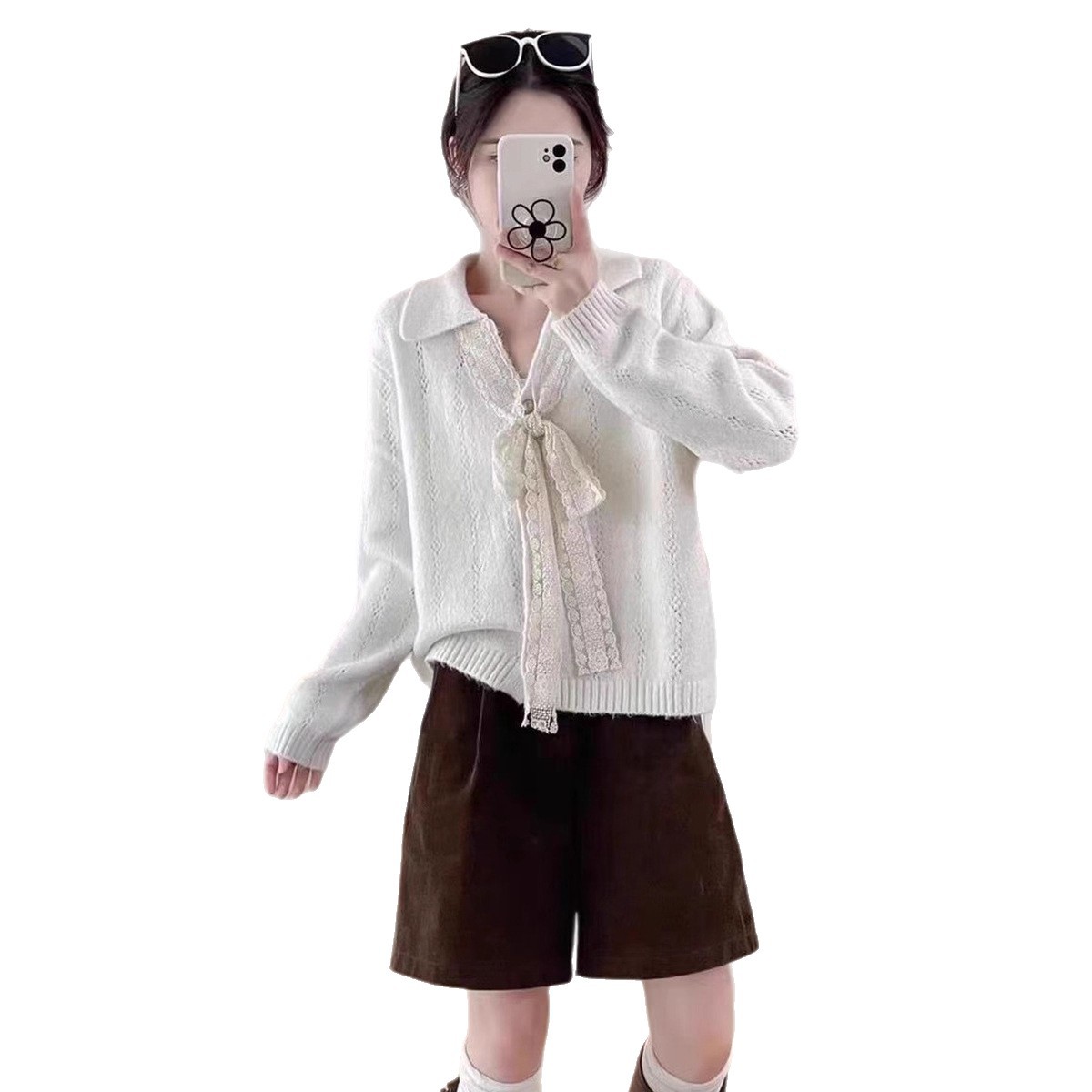 Elegant lapel knitwear women’s sweater featuring intricate lace-up design and delicate lace accents for a refined look.