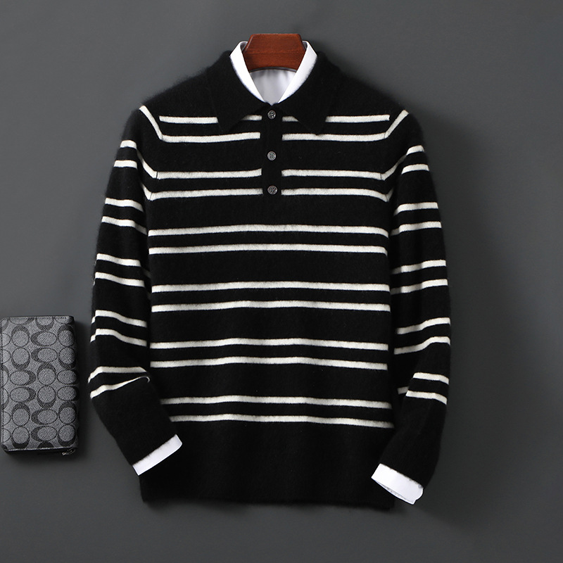 This lapel sweater is crafted from pure wool, providing softness and warmth. Featuring a striped color matching design, it includes a half-button placket for easy wear. The long sleeves and loose fit ensure comfort and versatility, making it suitable as an undergarment or standalone top. Its breathable material allows all-day wear, combining classic style with practical functionality.