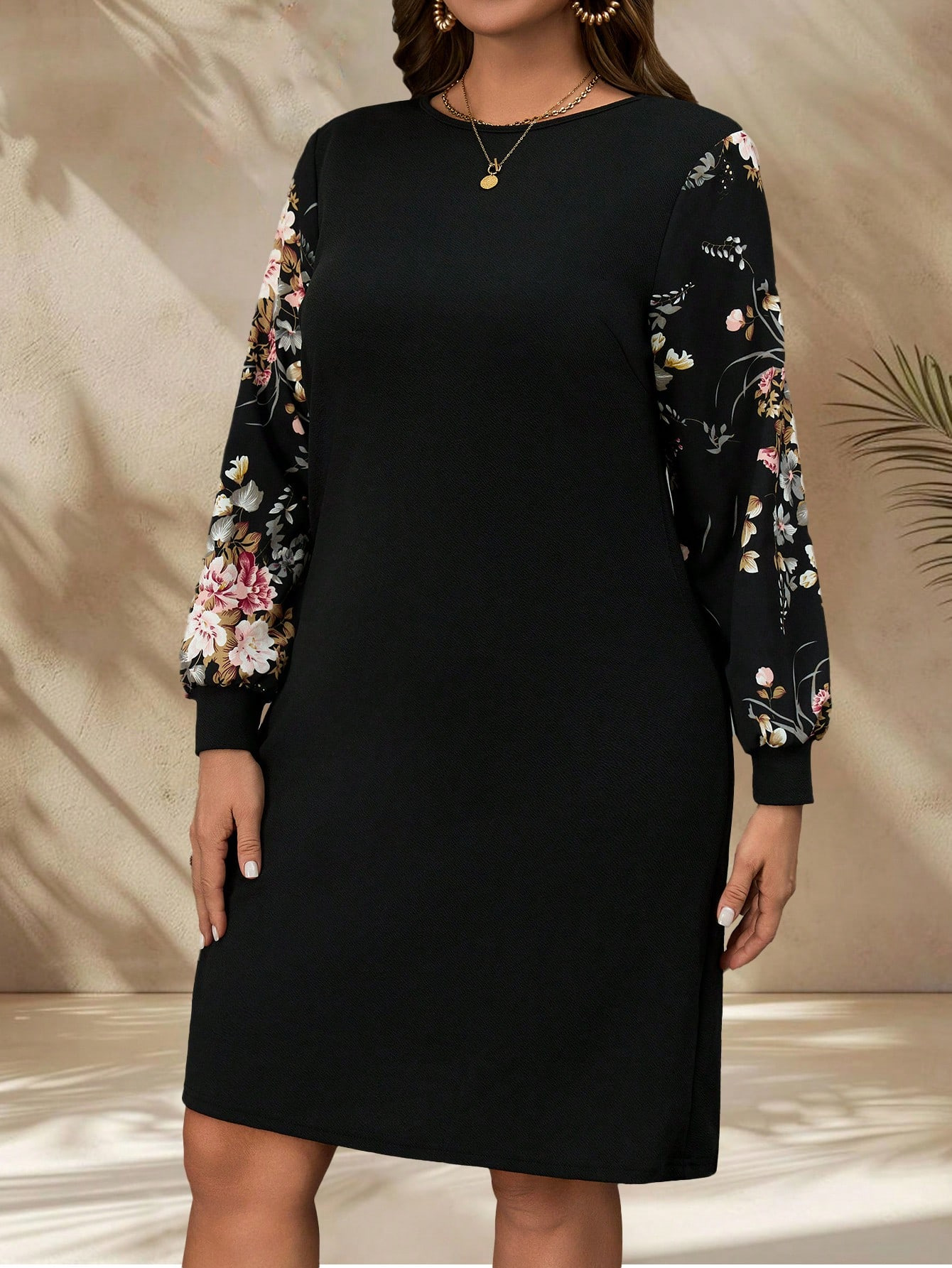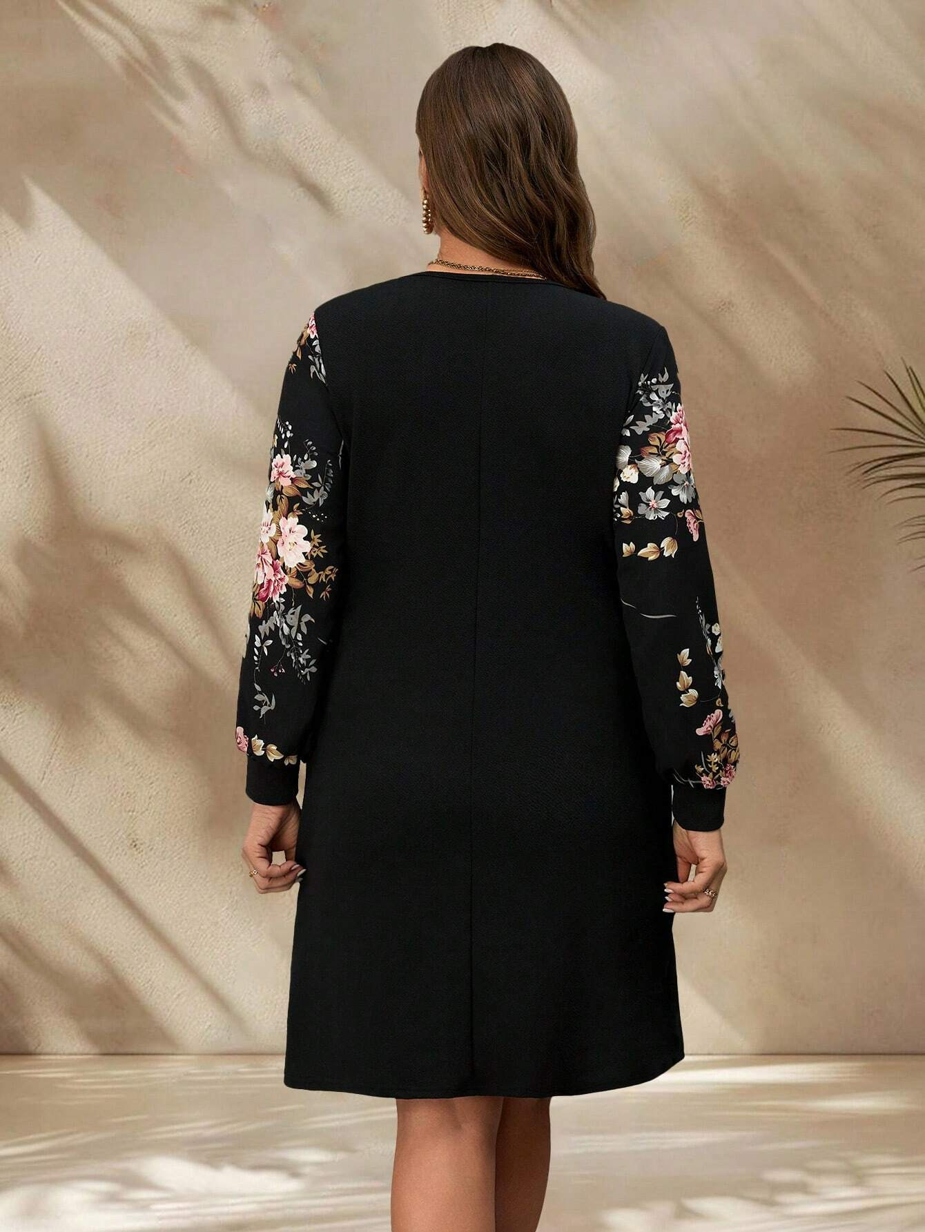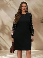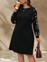Casual women’s large size printed short skirt featuring a round neck and long sleeves for comfortable everyday wear.