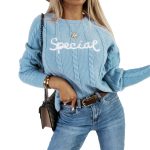 Stylish leisure pullover featuring embroidered letters and a comfortable crew neck knit design for casual wear.