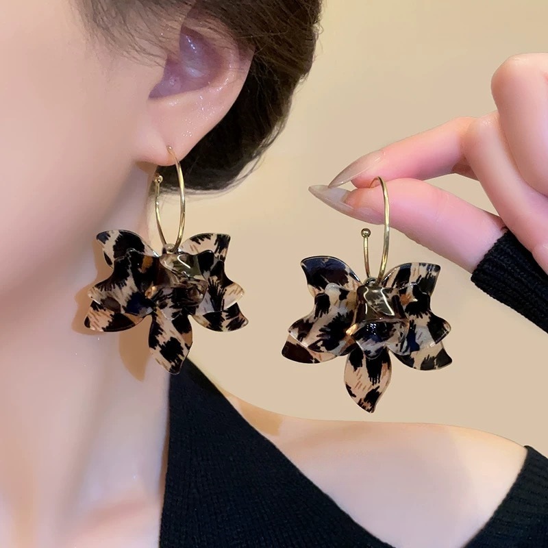These leopard print earrings feature an exaggerated floral design, offering a distinctive and sophisticated look. Crafted for those seeking a high-grade accessory, the niche style complements various outfits, adding a touch of temperament and elegance. The bold pattern combined with the refined floral motif creates a unique statement piece ideal for both casual and formal occasions.