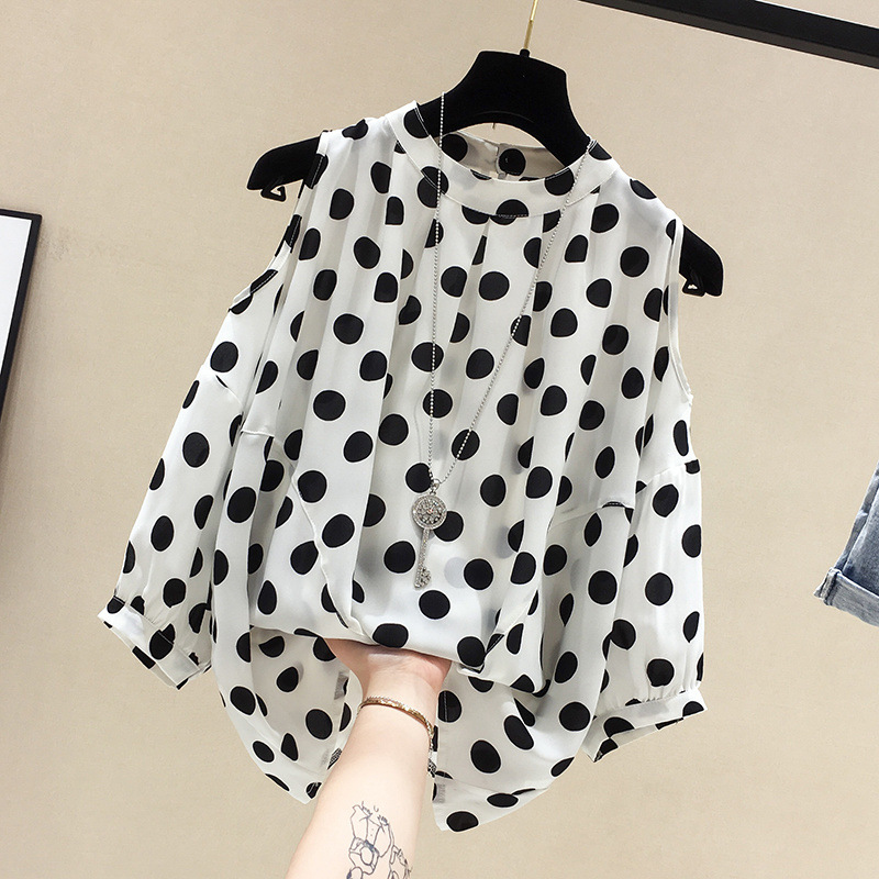 Be the first to review “Loose-fitting Figure-flattering Polka-dot Off-shoulder Short-sleeve Chiffon Blouse”