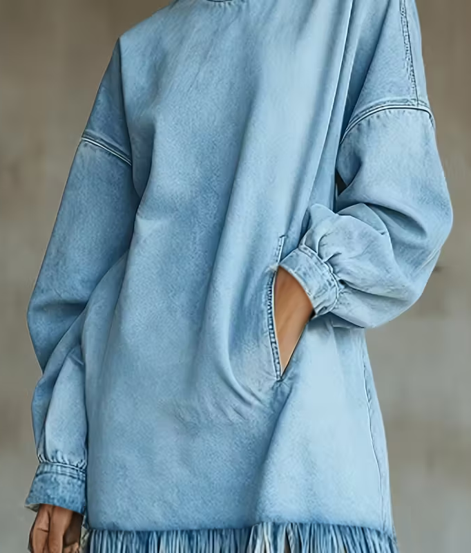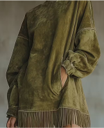 This long-sleeve suede dress features a relaxed, loose fit that enhances comfort and ease of movement. Crafted from high-quality suede material, it offers a soft texture and stylish appearance. The design incorporates functional pockets and decorative tassel accents, adding a fashionable touch while maintaining practicality. Ideal for casual and semi-formal occasions, this dress combines elegance with comfort in a versatile silhouette.