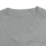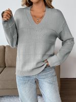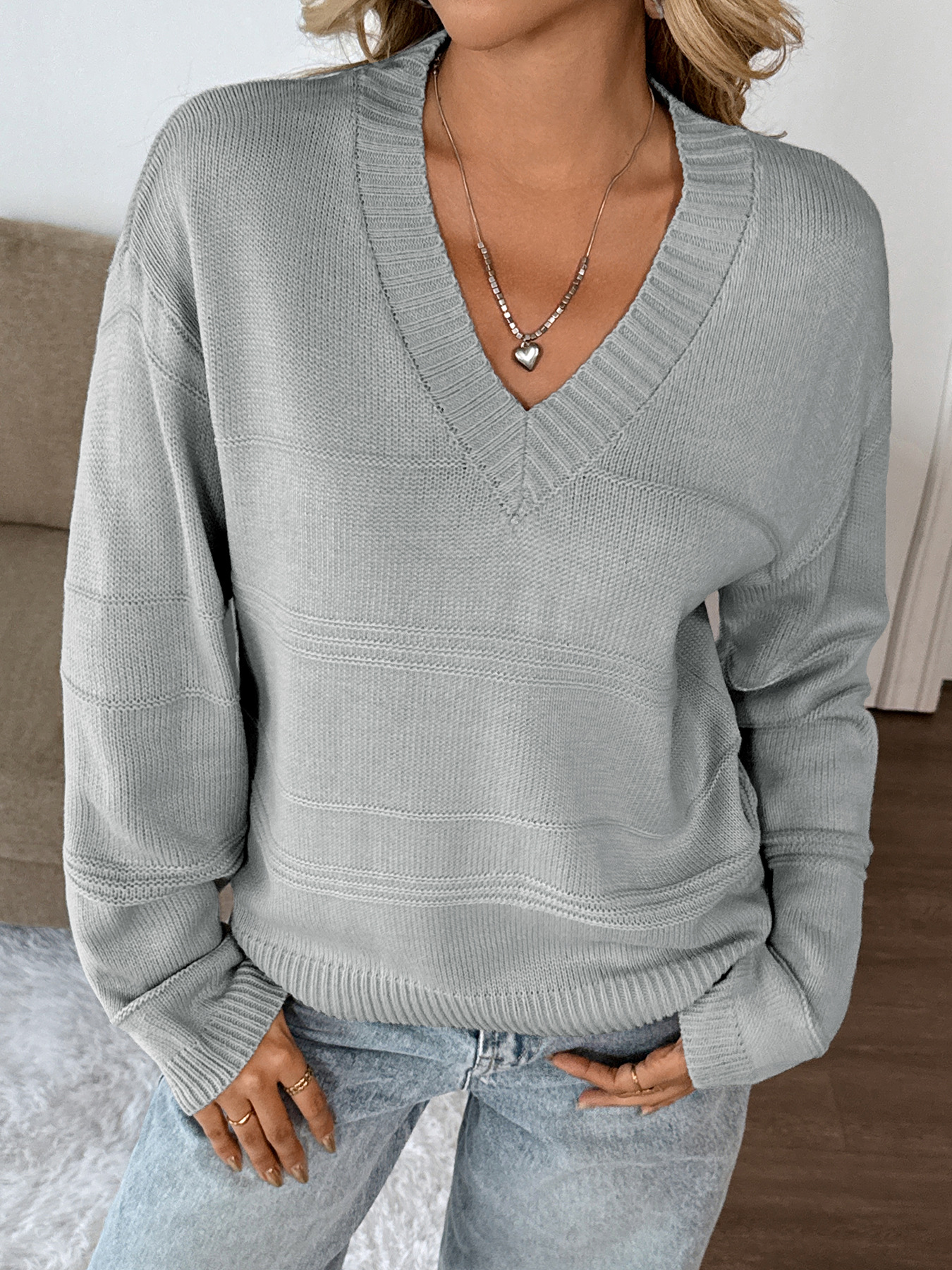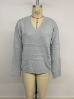 Stylish women’s sweater featuring a loose fit, deep V-neck, striped pattern, and solid color design for versatile comfort.