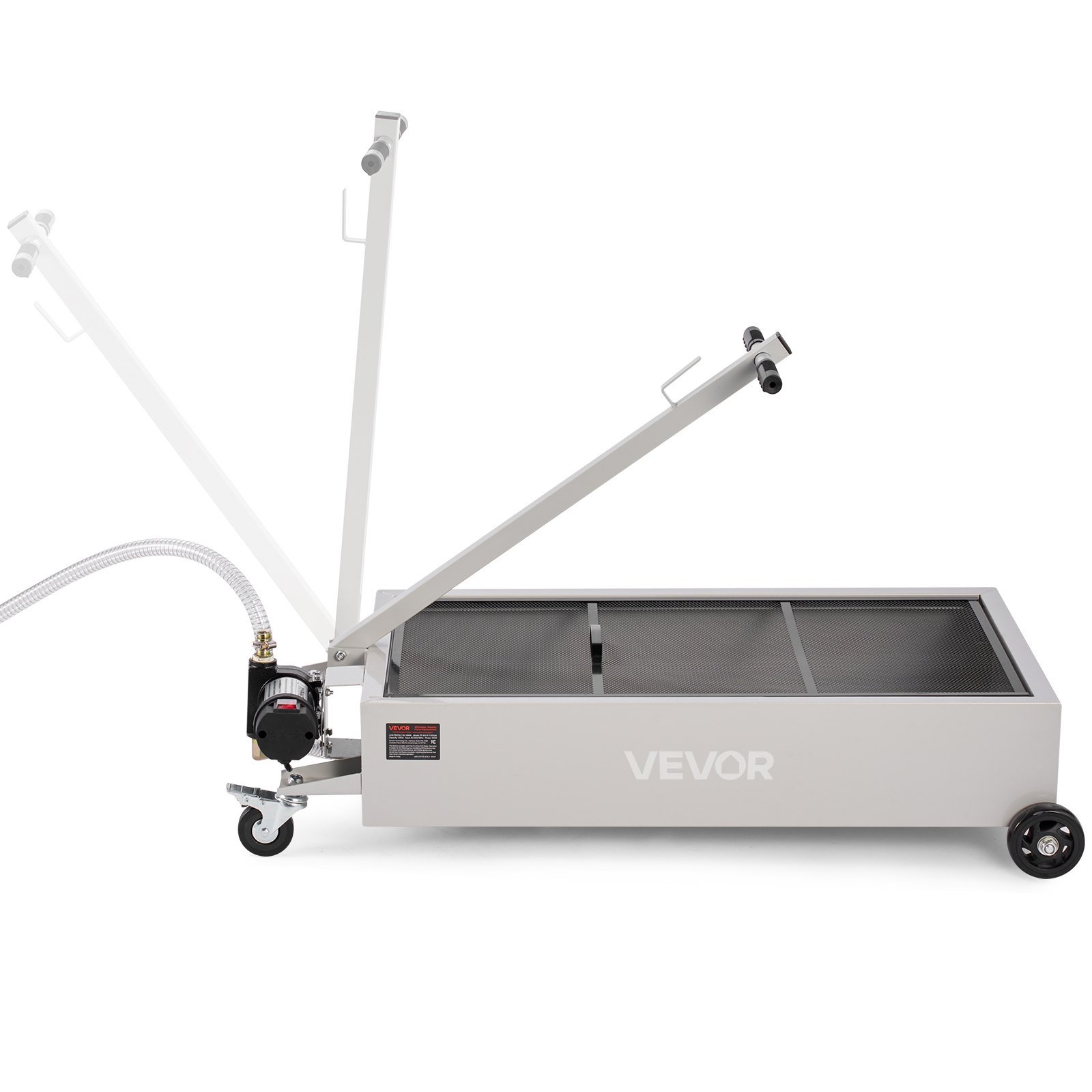 This low profile oil drain pan features a 20-gallon capacity designed to accommodate various vehicle types including cars, SUVs, trucks, and ATVs. Equipped with a rolling chassis and a foldable T-handle, it ensures easy maneuverability and storage. The integrated electric pump facilitates efficient oil drainage through a 7.2-foot hose, enhancing convenience during oil changes. Constructed with corrosion-resistant materials, the pan is leak-proof and built to withstand harsh environments, ensuring durability and long-term use. Its white finish offers a clean and professional appearance suitable for automotive maintenance settings.