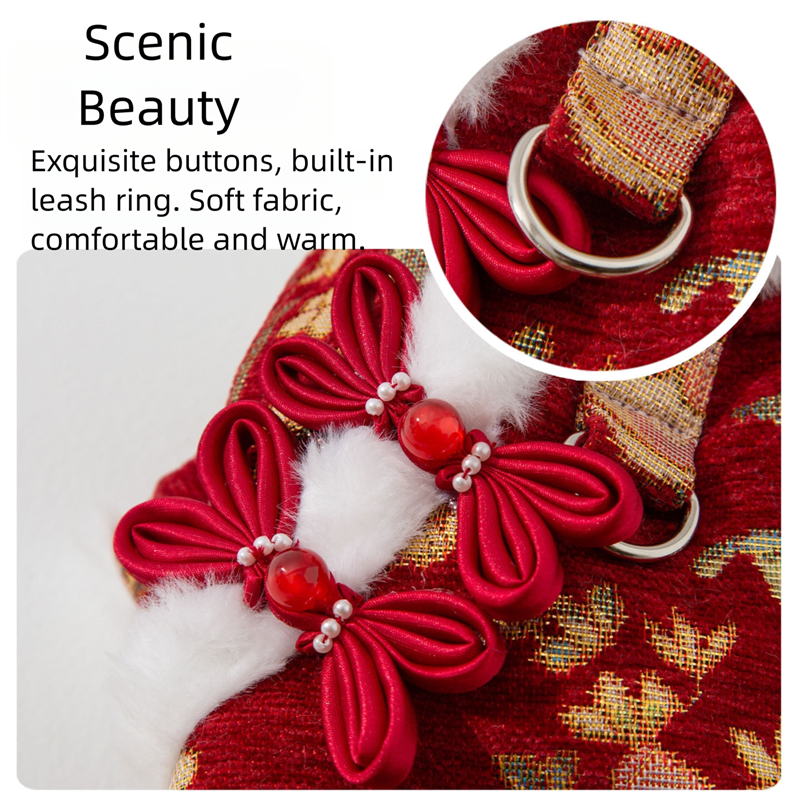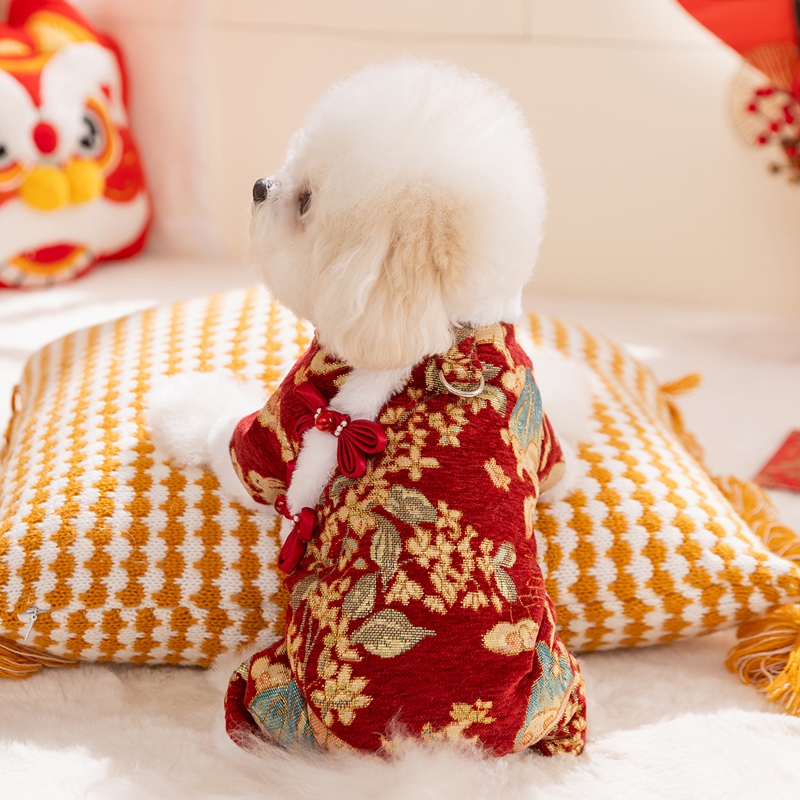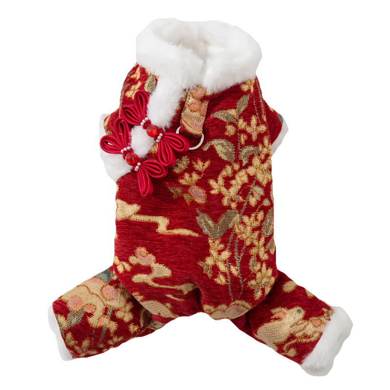 Festive Lunar New Year brocade pet jumpsuit with faux fur trim and traditional Chinese knot design for comfortable celebrations.