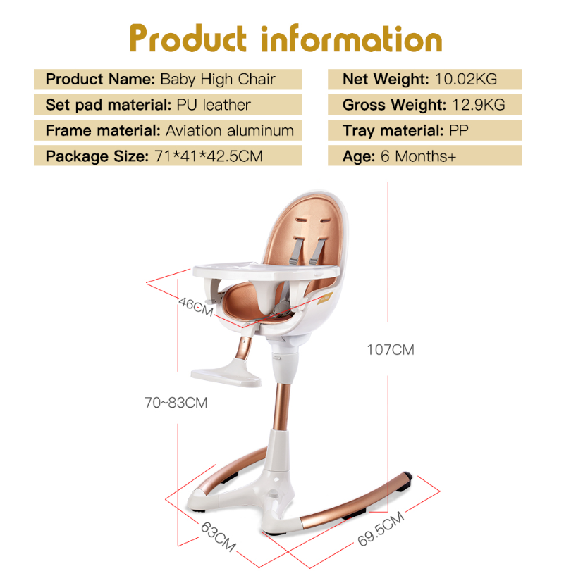 This luxury baby dining chair offers an adjustable seat height to accommodate growing infants, combined with a removable tray for easy cleaning and versatile use. Crafted with high-quality materials, the chair ensures durability and a premium feel, while the elegant white gold finish adds a sophisticated touch to any dining setting. Designed for safety and comfort, it provides sturdy support for your baby during mealtime, making it an ideal high-end seating solution.