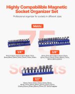 Durable 3-piece magnetic socket organizer set holds up to 75 standard and deep sockets with clear metric size labels for efficient tool storage.