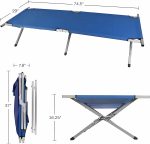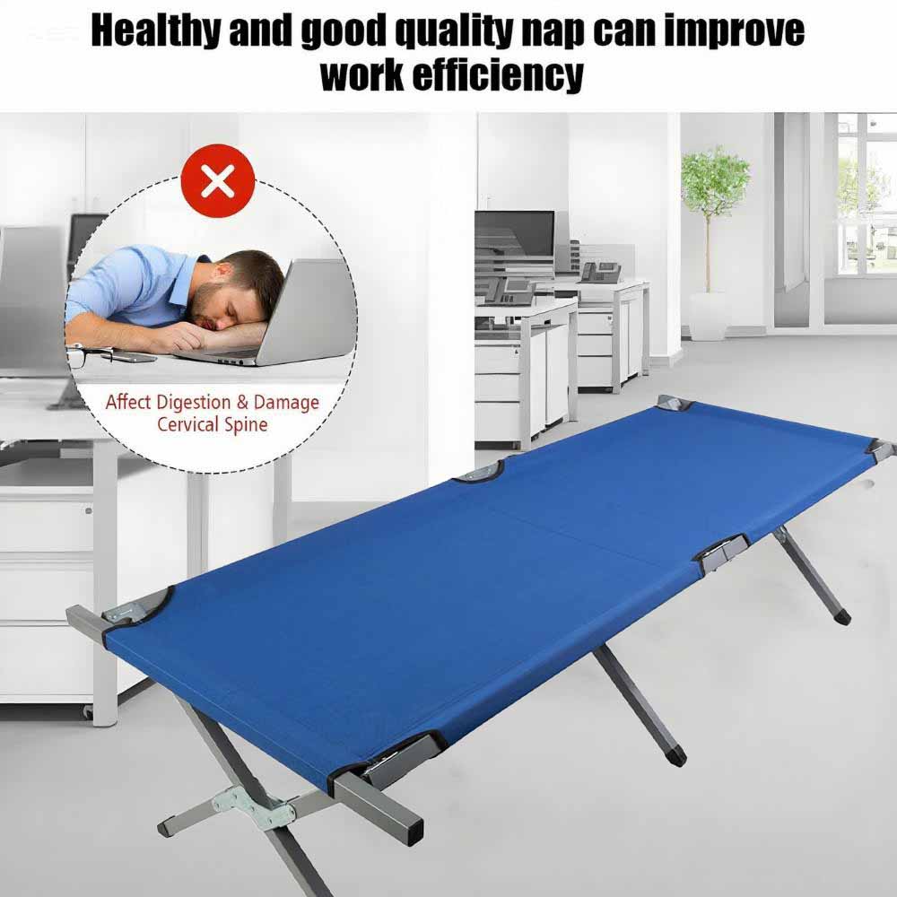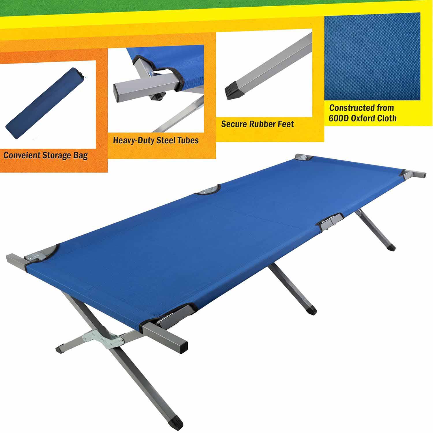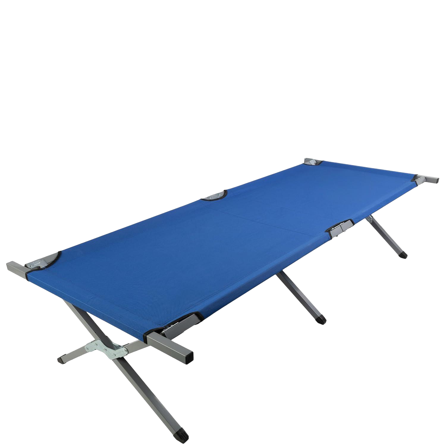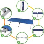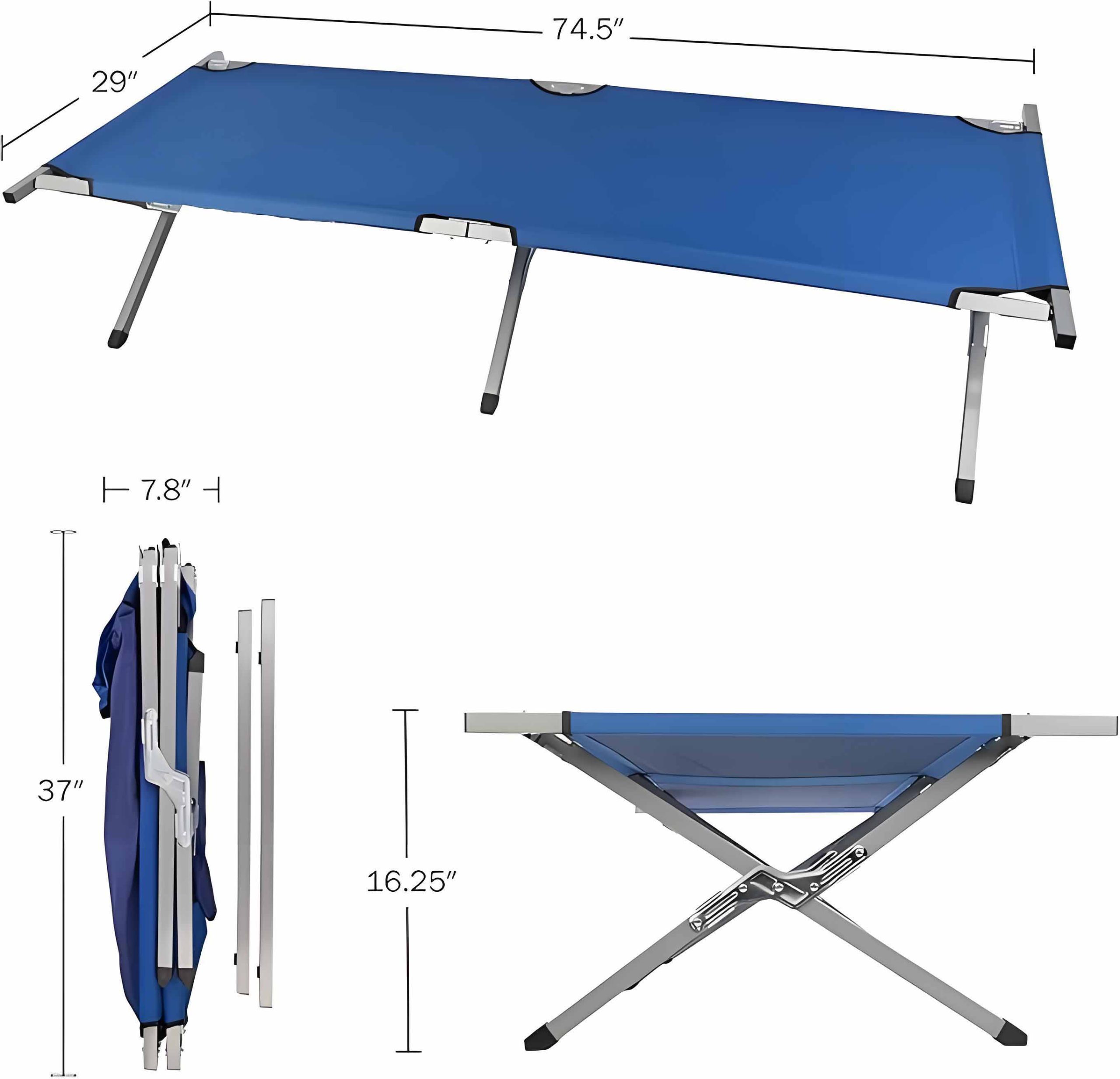 Durable, foldable lightweight camping bed with portable bag, ideal for adults on hiking, hunting, and outdoor trips in blue.
