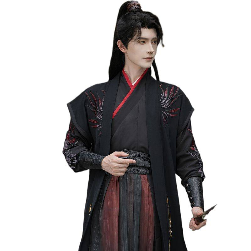 Detailed black and red embroidered martial arts cosplay costume, perfect for cosplay, martial arts events, or themed performances.
