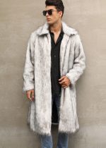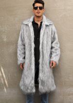 Stylish men’s long faux fur coat offering warmth and comfort for cold weather with a cozy, durable design.
