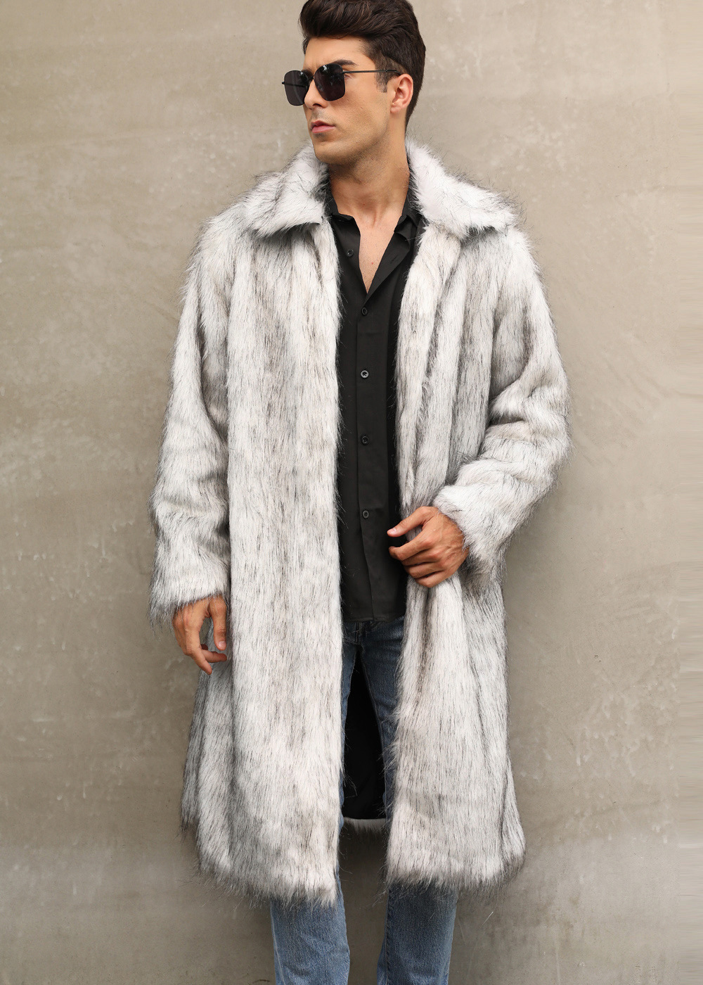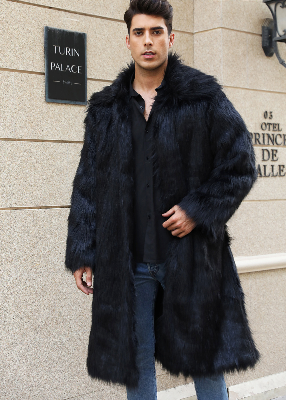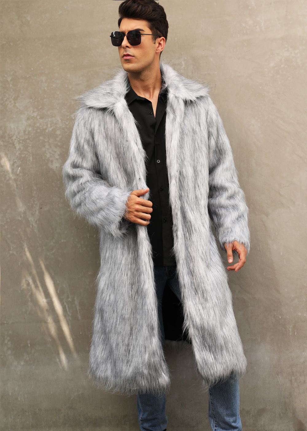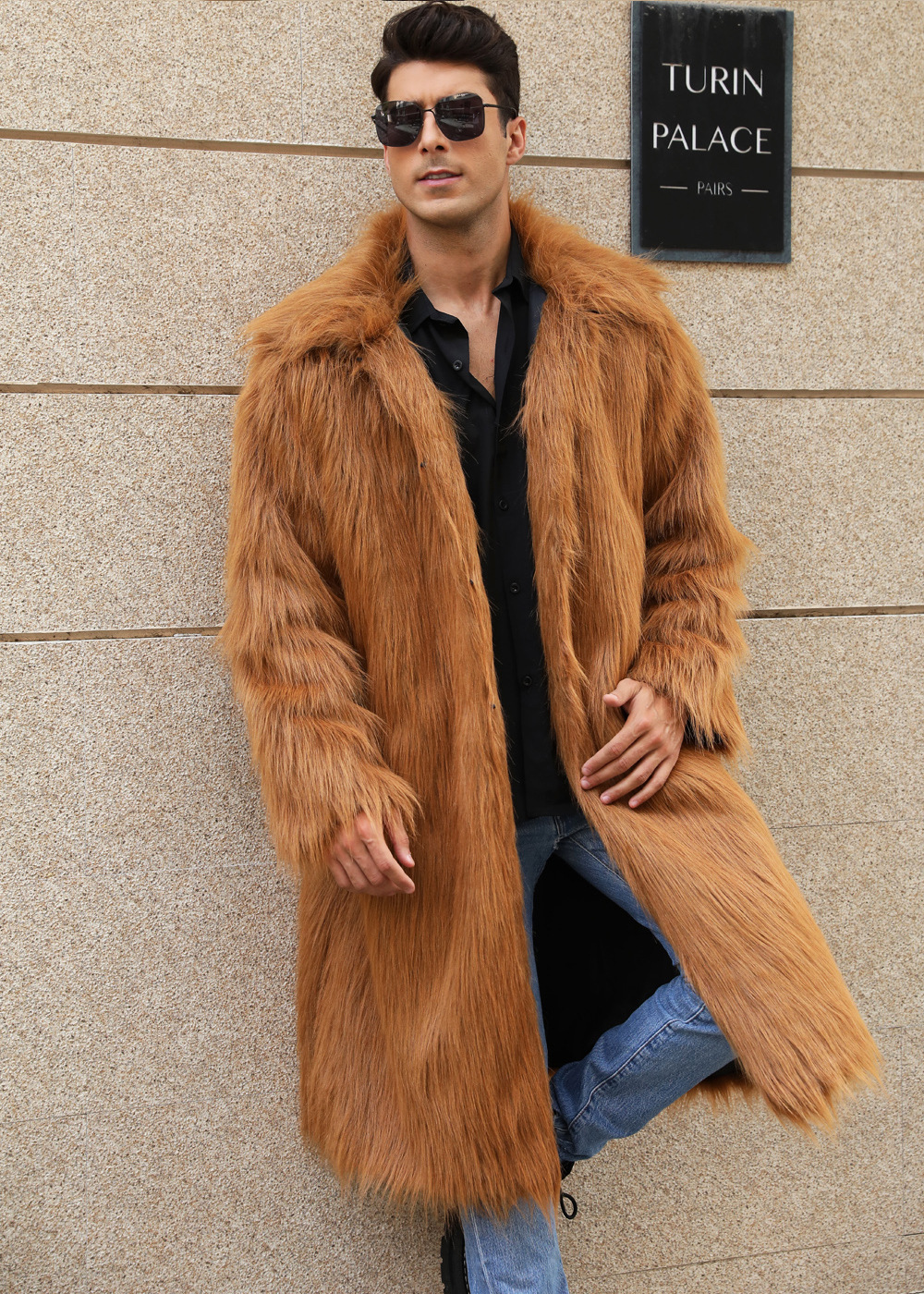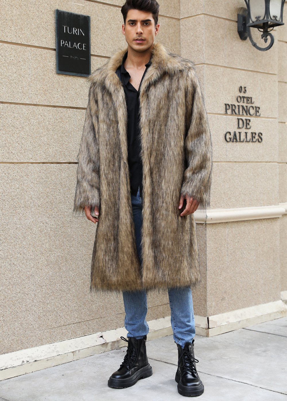 Stylish men’s long faux fur coat offering warmth and comfort for cold weather. Cozy design with premium materials.