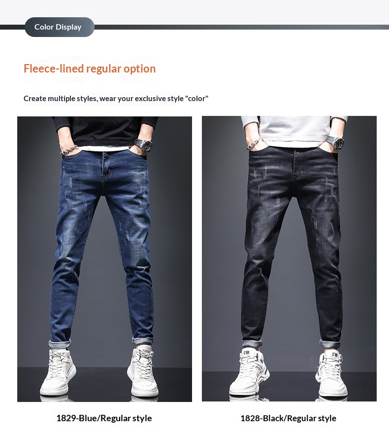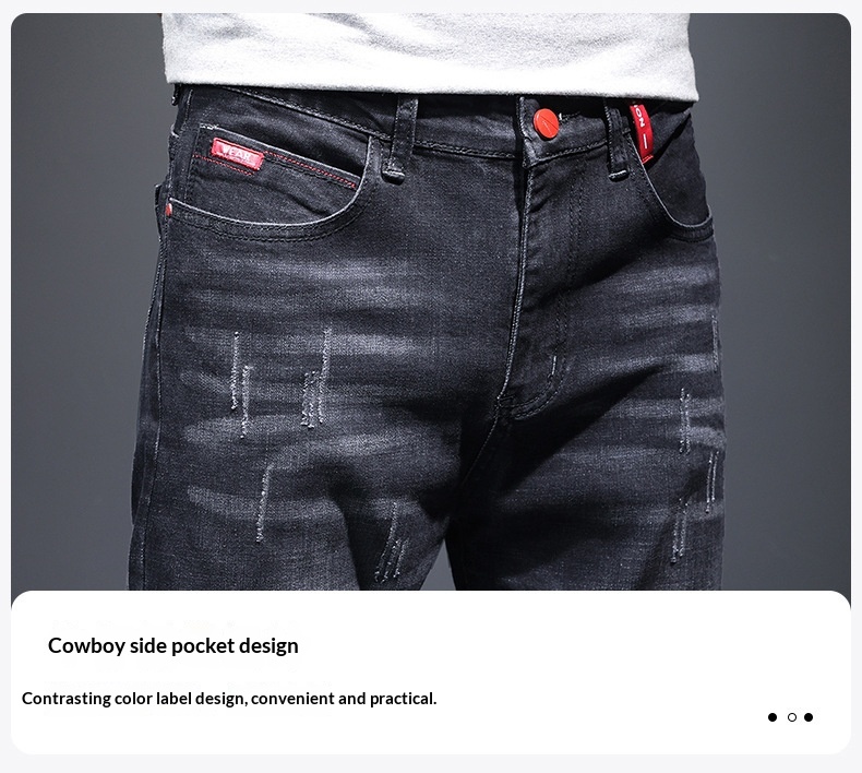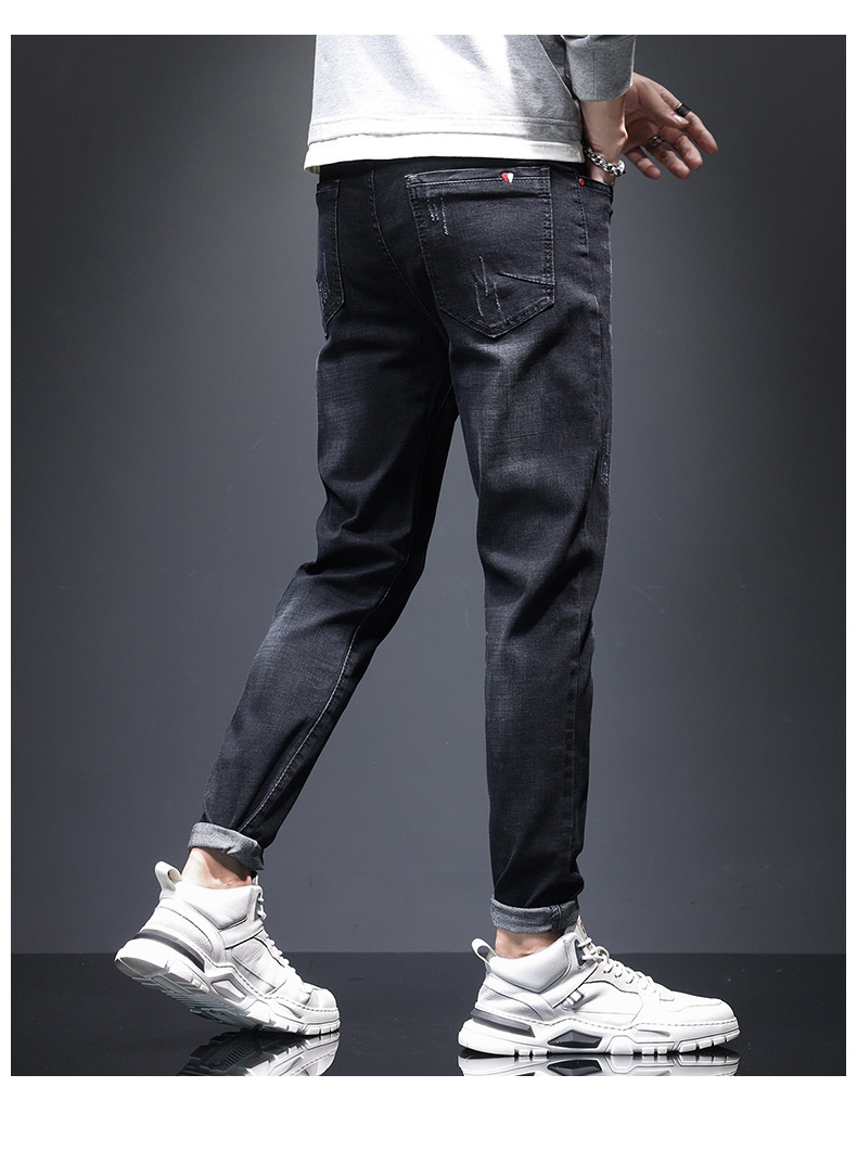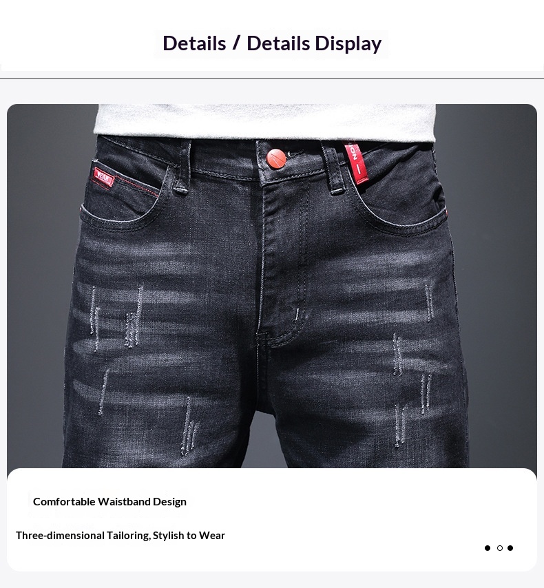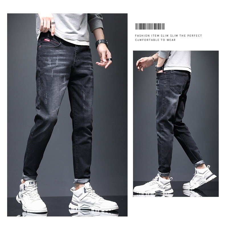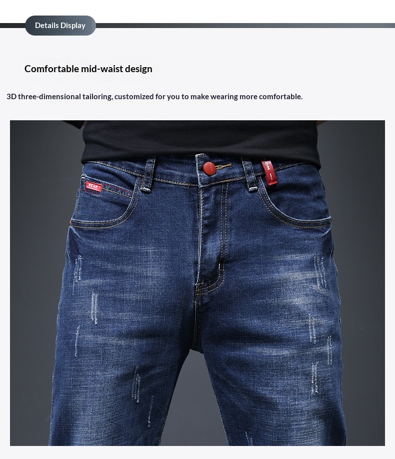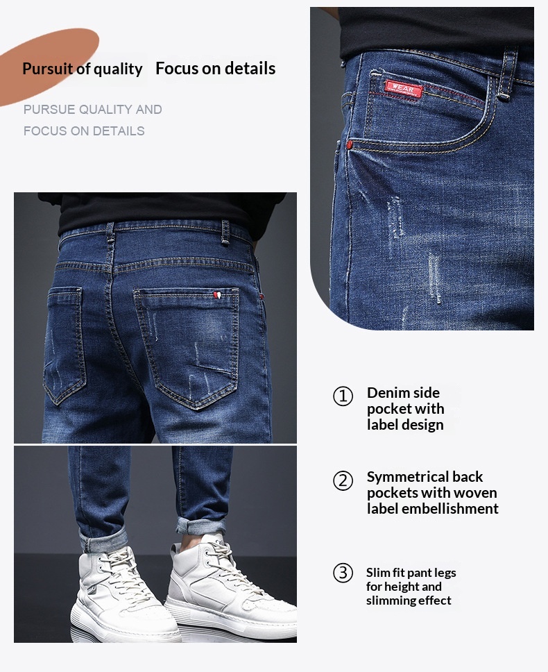 Stylish men’s ripped denim jeans featuring authentic cat-whisker scratch details for a modern, rugged look.