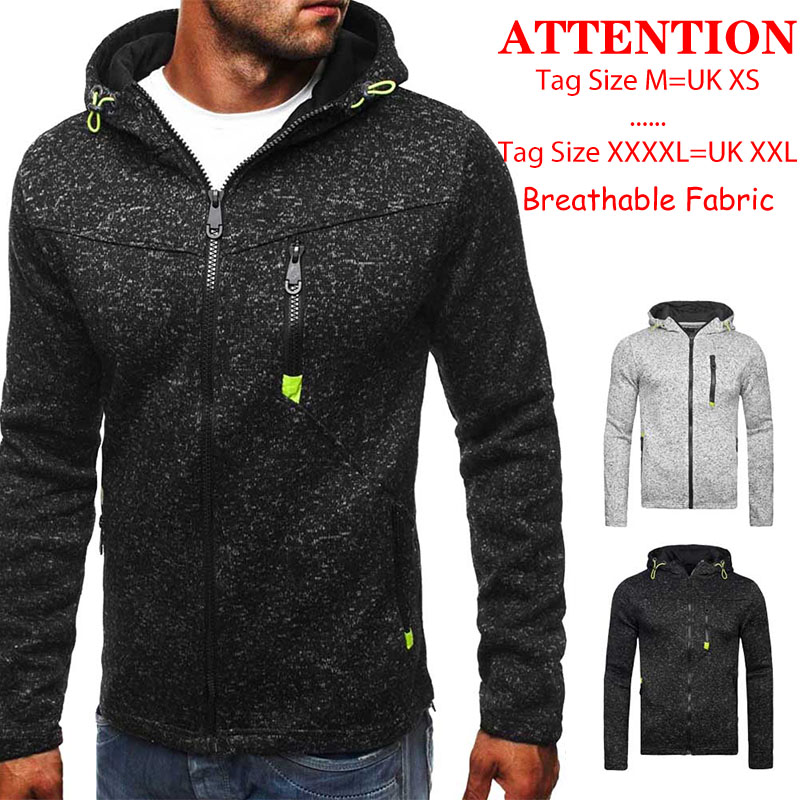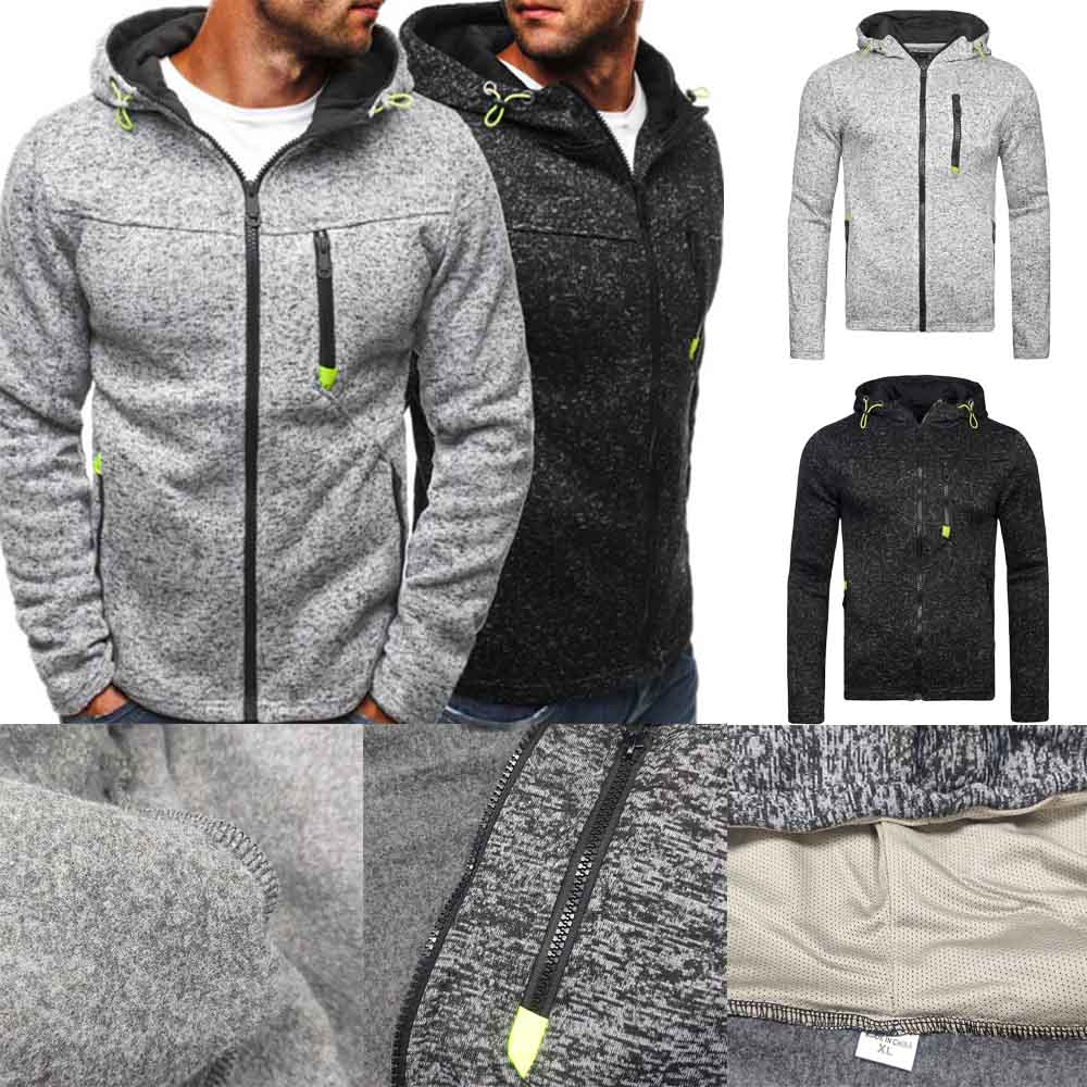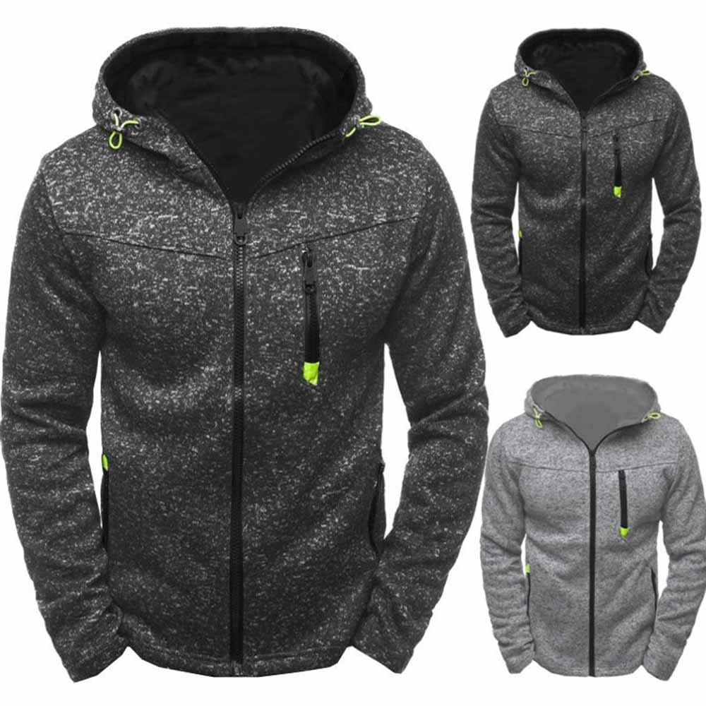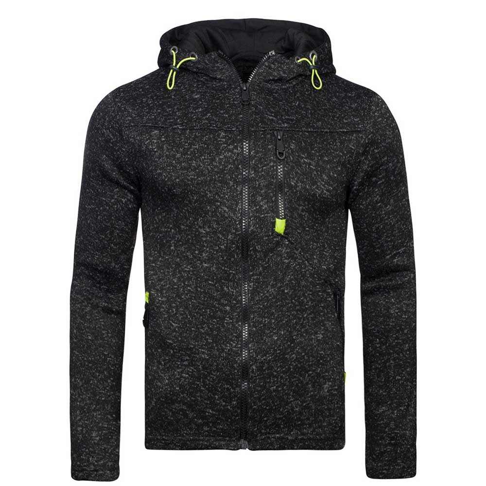 Men’s fleece pullover hoodie with full zipper, two front pockets, and long sleeves in grey and black colors.