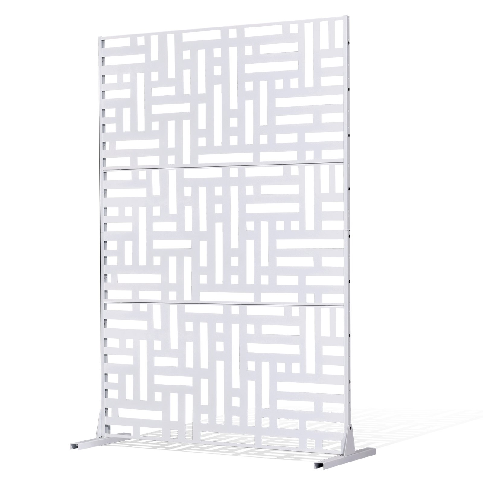 This metal privacy screen measures 47 inches wide by 76 inches high and features a three-panel design, providing effective visual coverage for outdoor or indoor spaces. Constructed from durable steel with a white finish, it offers a decorative yet functional solution for enhancing privacy on balconies, patios, gardens, or around hot tubs. The freestanding design includes a stable base, allowing easy placement without installation. Its elegant construction blends seamlessly into various environments, making it suitable as a room divider or a privacy fence. Resistant to weather elements, it combines strength and style to improve the ambiance and security of any setting.