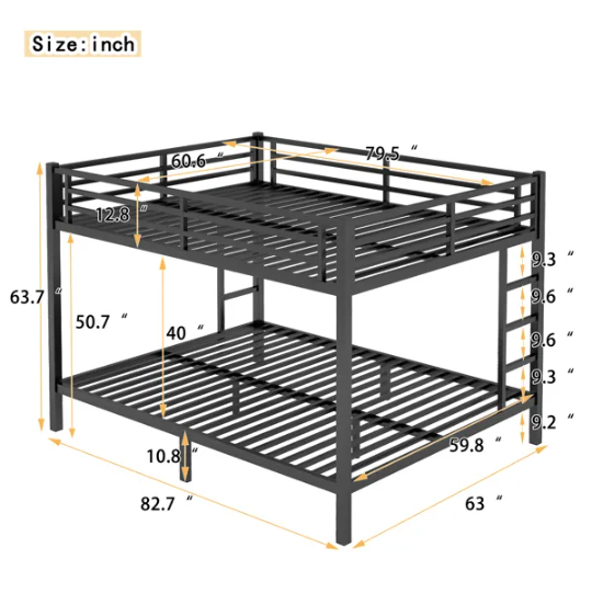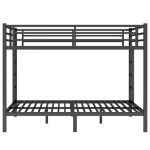 This metal queen over queen bunk bed is expertly designed to accommodate both teens and adults while maximizing space efficiency. Constructed with sturdy metal frames, it offers enhanced durability and stability. The bed features a noise-reduction design for quiet use and eliminates the need for a box spring, simplifying setup and maintenance. Finished in a sleek black color, it complements a variety of décor styles. Its space-saving layout is ideal for shared bedrooms or guest rooms, providing two queen-sized sleeping areas stacked vertically to optimize room space without compromising comfort or support.