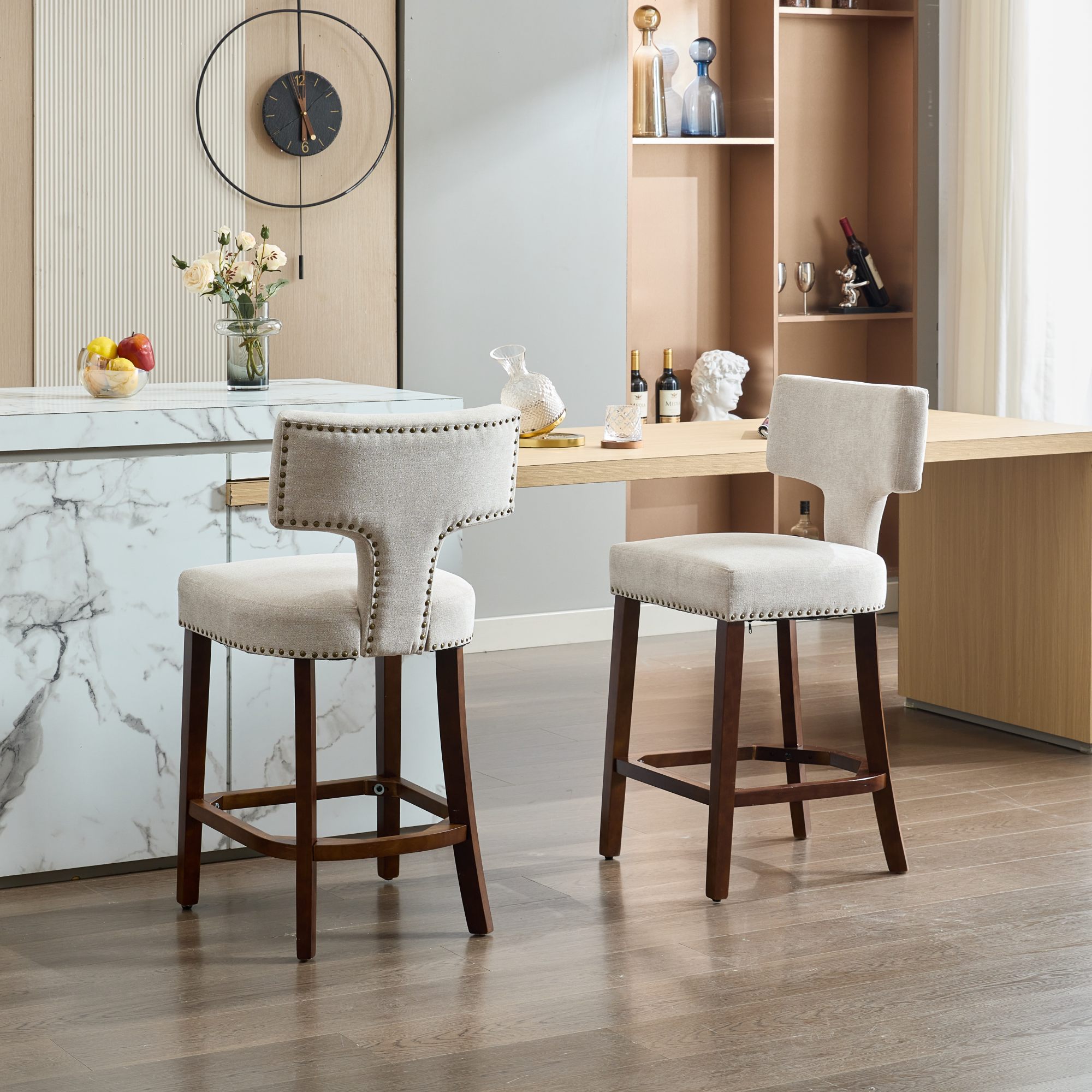 This set of two mid century modern counter height bar stools features a farmhouse design with beige linen fabric upholstery. Each stool is crafted with a durable hardwood frame, providing stability and longevity. The curved backrest offers comfortable support, enhanced by decorative copper nail accents that add an elegant touch. These kitchen chairs combine style and function, making them ideal for bar counters or breakfast areas.