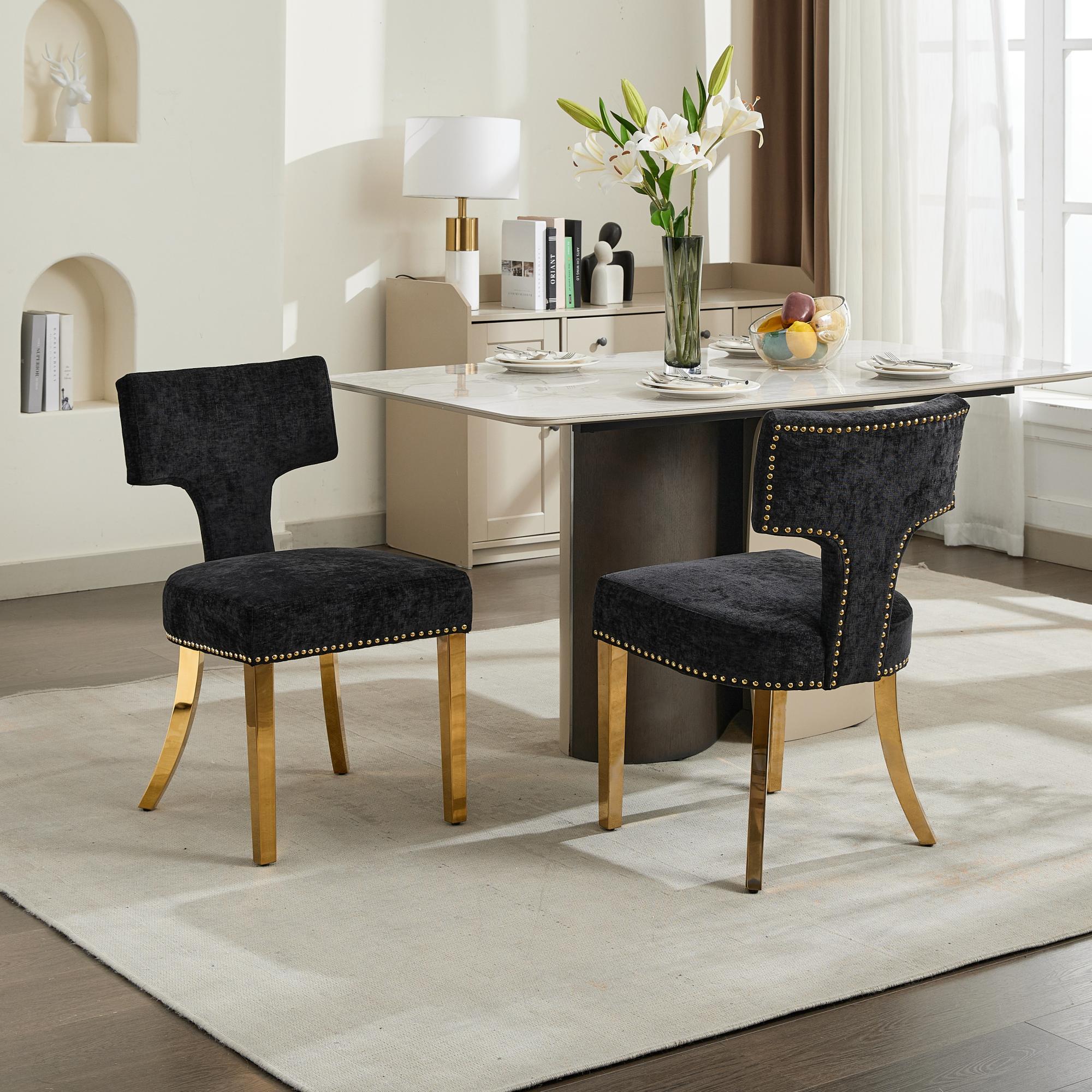 This set of two mid century modern dining chairs combines farmhouse charm with contemporary design. Upholstered in soft chenille fabric, each chair features a comfortable curved backrest enhanced with copper nailhead trim for a refined appearance. The legs are crafted from durable stainless steel plated in gold, offering both stability and a sleek, stylish contrast with the black upholstery. These kitchen chairs provide both aesthetic appeal and functional comfort, suitable for dining rooms or accent seating.