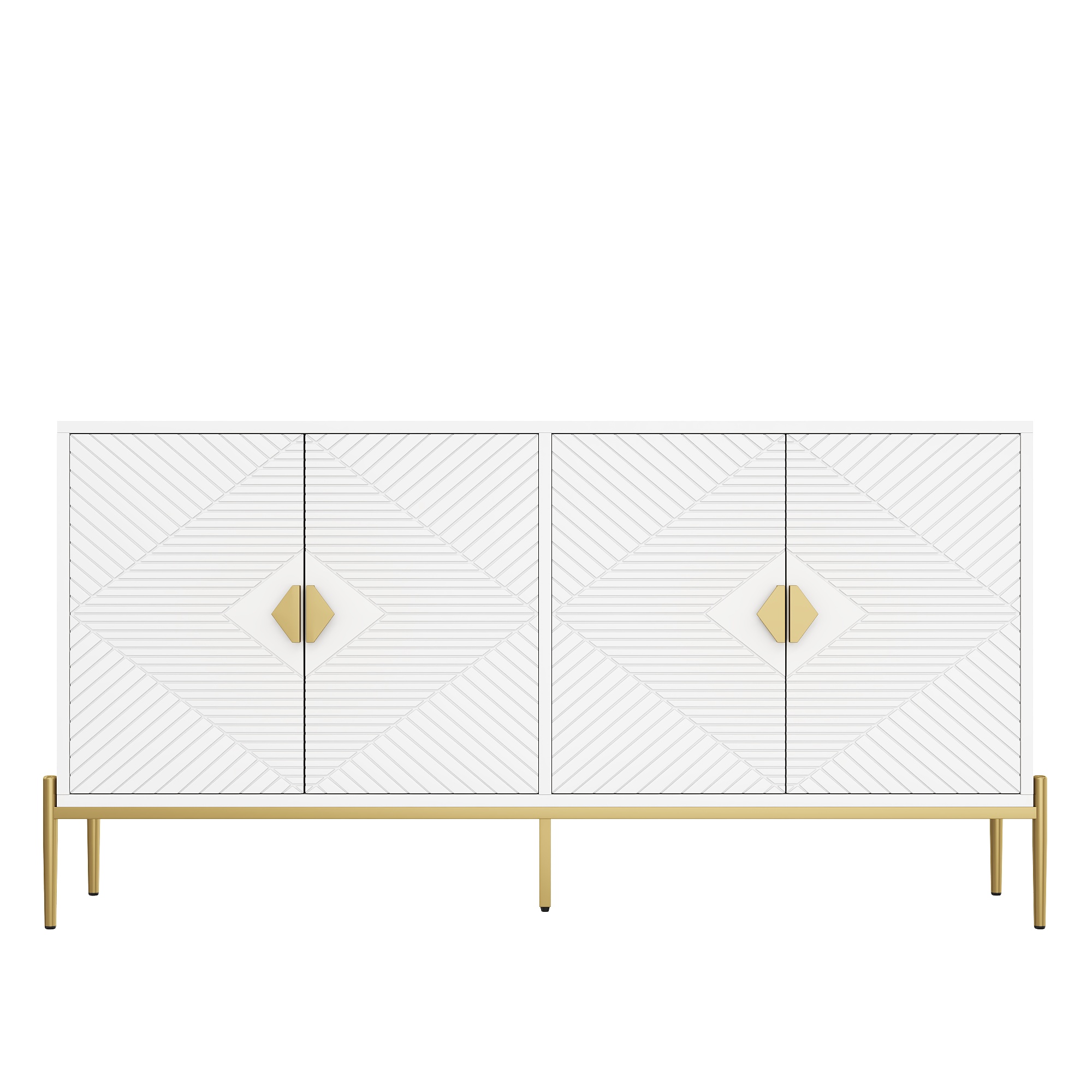 This modern, light, and luxurious geometric sideboard impresses with its simple and elegant white color palette, complemented by striking geometric 3D textures and golden metal accents that create a unique mid-century modern style. The thoughtfully designed interior makes it a wonderful addition to any home! It ensures the durability of the cabinet while adding a sense of depth. The metal legs enhance the stability of the cabinet and give the space a modern touch. Whether placed in the living room, dining room, or entryway, this sideboard blends seamlessly with any home décor and stands out as a remarkable piece of furniture that combines aesthetics and functionality.