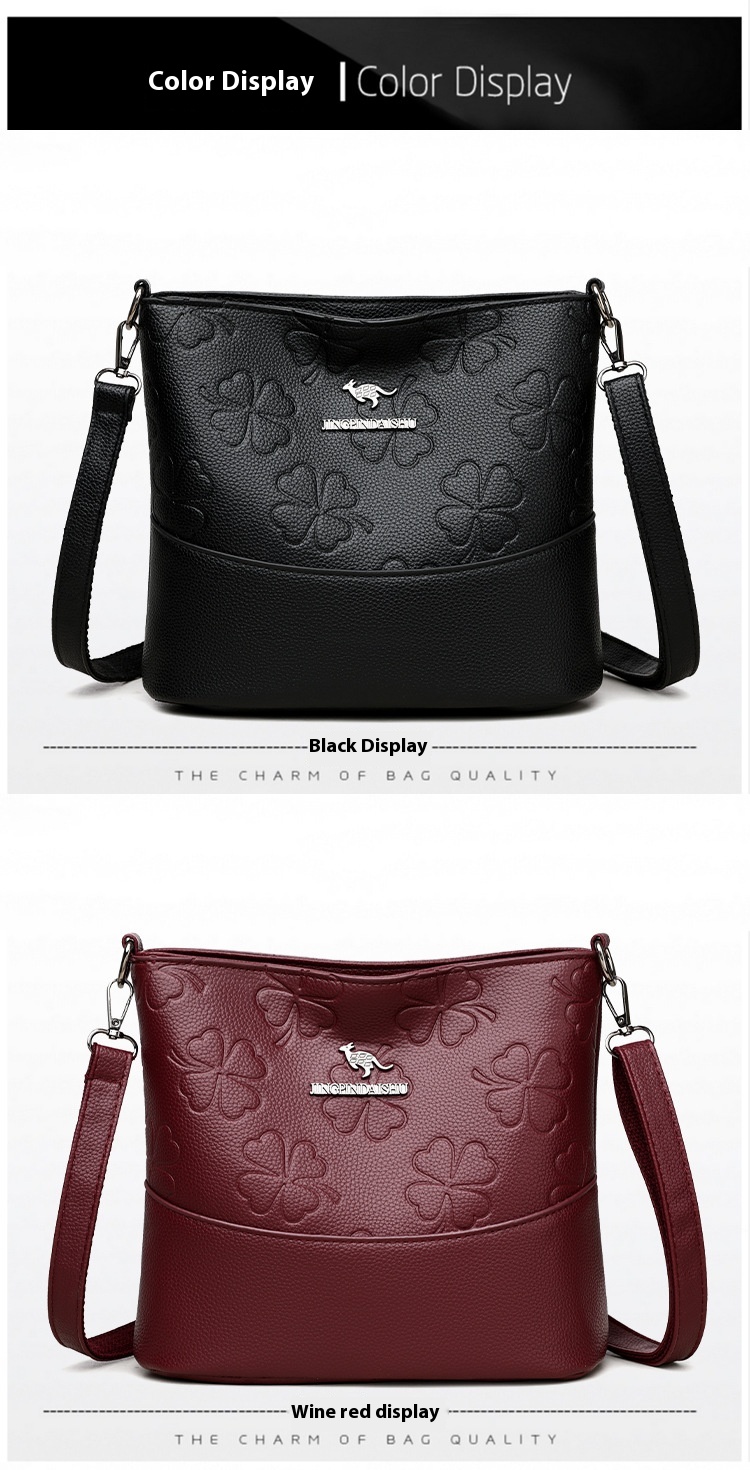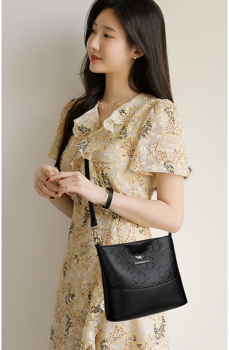 Spacious multi-layer soft leather bucket bag designed for women’s shoulder use, combining style and practicality in a messenger design.