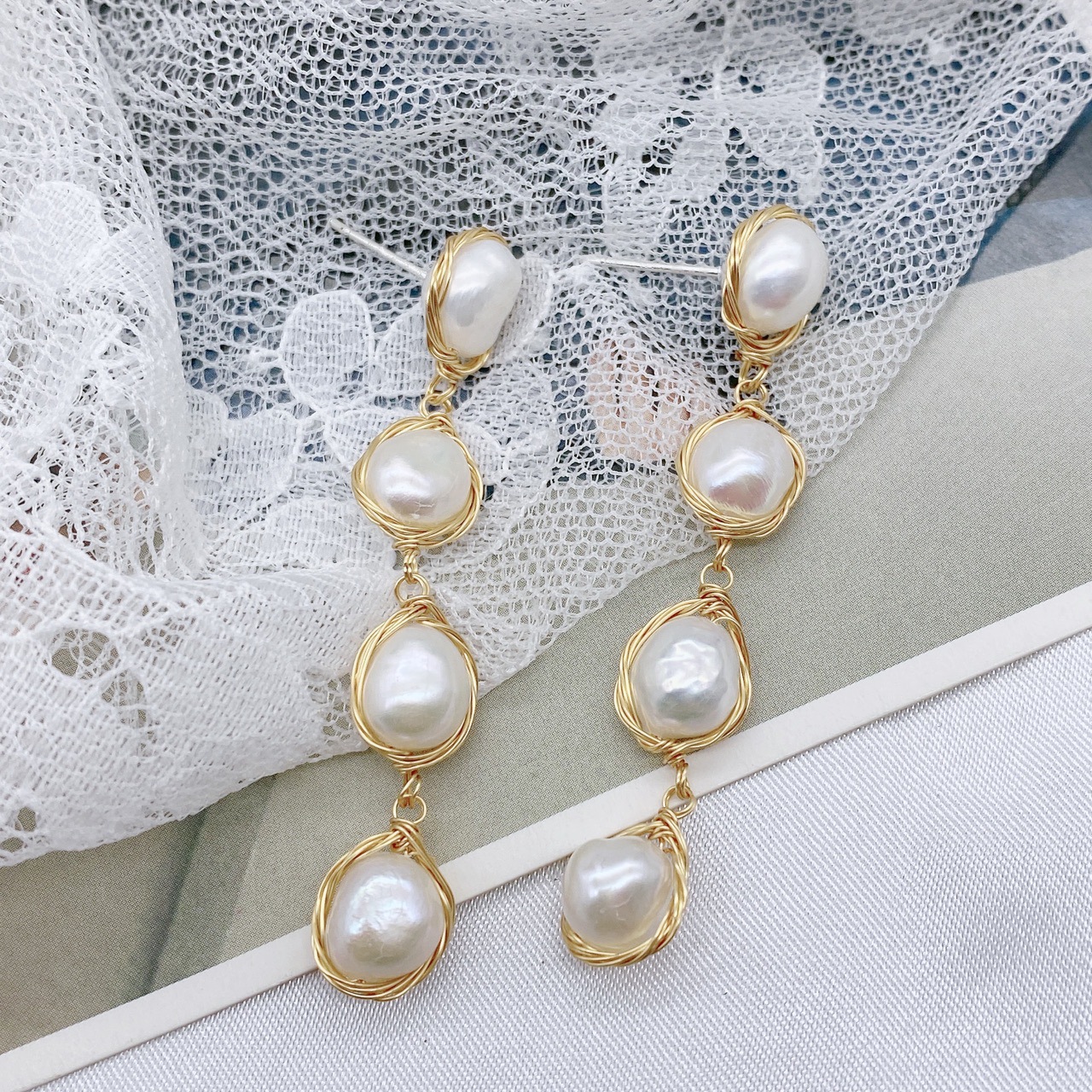 Sophisticated natural pearl long tassel earrings designed for a simple and elegant feminine style.