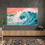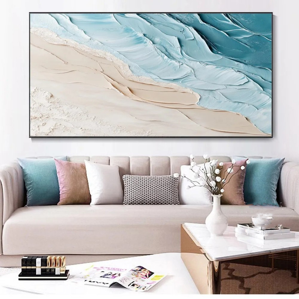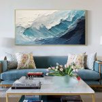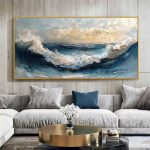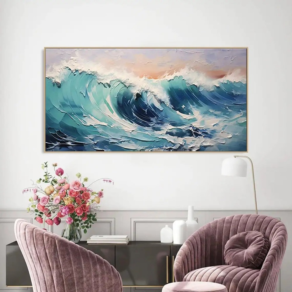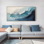 Handcrafted large oil painting featuring blue and white ocean waves with textured landscape, perfect for living room wall decoration.